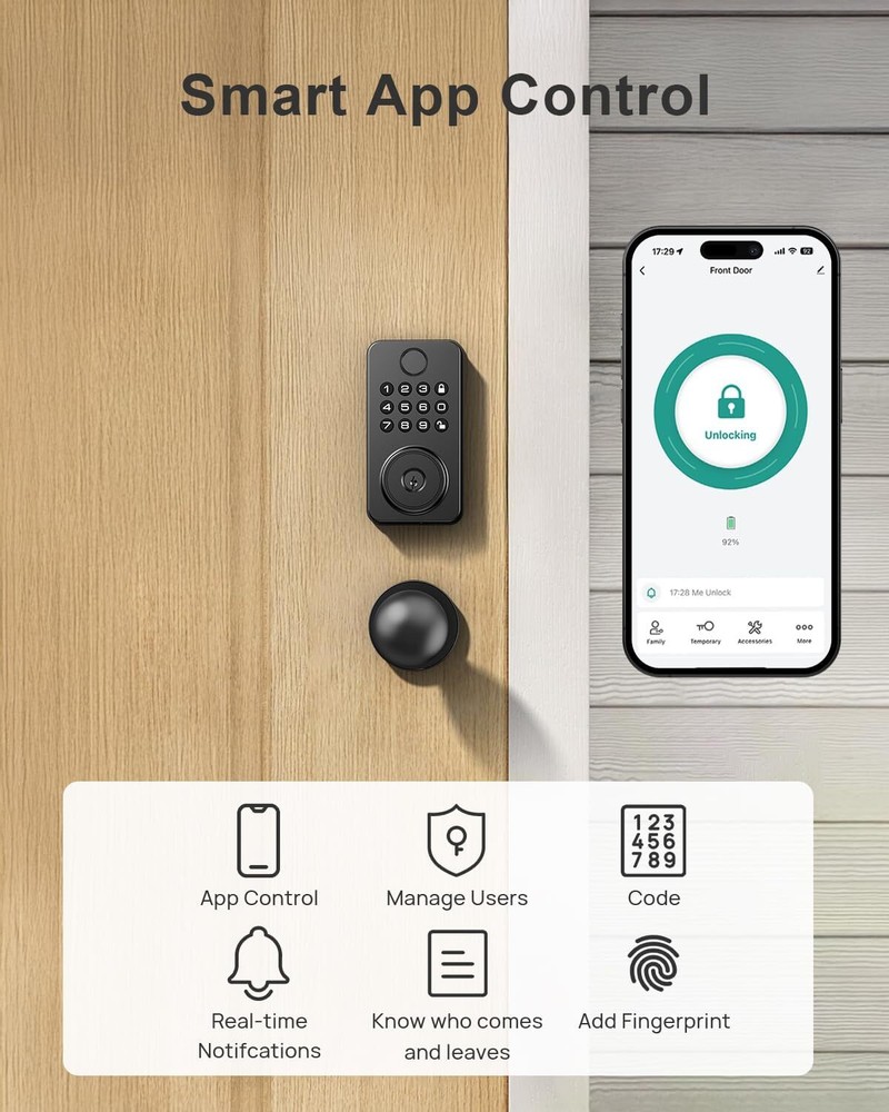 ๐—ฌ๐—ผ๐˜‚๐—ฟ ๐—™๐—ถ๐—ป๐—ด๐—ฒ๐—ฟ ๐—œ๐˜€ ๐—ง๐—ต๐—ฒ ๐—ž๐—ฒ๐˜†: NBBX fingerprint door locks use self-learning AI for faster, more accurate recognition with every touchโ€”unlock in just 0.3 seconds with a 99% success rate. No more repeated attempts or frustration! ๐— ๐˜‚๐—น๐˜๐—ถ๐—ฝ๐—น๐—ฒ ๐—ช๐—ฎ๐˜†๐˜€ ๐—ง๐—ผ ๐—จ๐—ป๐—น๐—ผ๐—ฐ๐—ธ: Choose from fingerprint, code, app control, or key access. Store up to 50 fingerprints and 50 codes, ensuring easy entry for the whole family ๐—•๐˜‚๐—ถ๐—น๐˜ ๐—™๐—ผ๐—ฟ ๐—ฆ๐—ฒ๐—ฐ๐˜‚๐—ฟ๐—ถ๐˜๐˜† & ๐——๐˜‚๐—ฟ๐—ฎ๐—ฏ๐—ถ๐—น๐—ถ๐˜๐˜†: Crafted with solid components, tested for 250,000 cycles, and rated IP65 waterproof, this smart lock withstands any weather, operating flawlessly from -4ยฐF to 122ยฐF ๐—ฆ๐—บ๐—ฎ๐—ฟ๐˜ ๐—”๐—ฐ๐—ฐ๐—ฒ๐˜€๐˜€ ๐—–๐—ผ๐—ป๐˜๐—ฟ๐—ผ๐—น: Grant unique codes to family, guests, or neighbors, and revoke access anytime via the appโ€”perfect for short-term rentals, and temporary or scheduled visitors. You can also assign one-time codes to delivery or maintenance staff for hassle-free, secure access ๐—”๐—ฝ๐—ฝ-๐—–๐—ผ๐—ป๐˜๐—ฟ๐—ผ๐—น๐—น๐—ฒ๐—ฑ ๐—–๐—ผ๐—ป๐˜ƒ๐—ฒ๐—ป๐—ถ๐—ฒ๐—ป๐—ฐ๐—ฒ: Get real-time notifications of door activity, review access history, and set auto-lock from 1 sec. To 30 min. for peace of mind on the free app ๐—˜๐—ฎ๐˜€๐˜† ๐—œ๐—ป๐˜€๐˜๐—ฎ๐—น๐—น & ๐—ง๐—ฟ๐˜‚๐˜€๐˜๐—ฒ๐—ฑ ๐—ฆ๐˜‚๐—ฝ๐—ฝ๐—ผ๐—ฟ๐˜: Install the N201 electronic keypad deadbolt in 15 minutes with a screwdriverโ€”no locksmith needed. Enjoy lifetime customer support, a 30-day worry-free, and one-year product coverage ๐๐๐๐—โ€”Secure, Smart, and Effortless