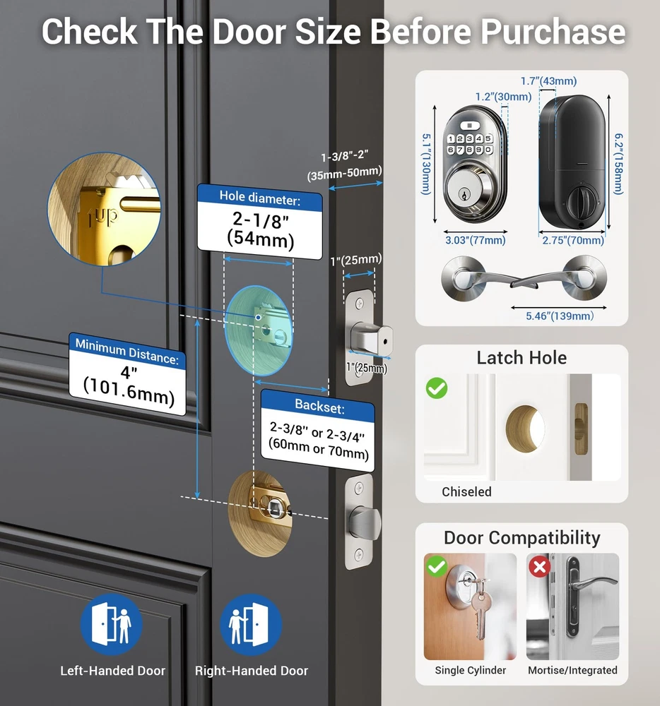 Keyless Entry: Stores twenty permanent PIN codes, retains backup keys, and generates a -time code for guests that automatically deletes after use Quick Locking: Set the door lock to automatically lock within 10-99 seconds. Press any key for seconds to instantly lock from outside Keypad Door Lock with Handle: Features a deadbolt with matching lever handles, backlit keypad, low battery alerts, silent mode, and vacation mode. Waterproof design complements traditional and modern homes Long-Lasting Home Protection: ANSI 3 certified construction with sturdy alloy materials. Powered by four AA batteries (more than year operation in all weather conditions) Easy Installation: Install and program within minutes using a screwdriver. with standard US left and right-opening doors offers at least a 1-year product , online support from Monday to Friday, 9 AM to 5 PM PST, and 24/7 after-sales service