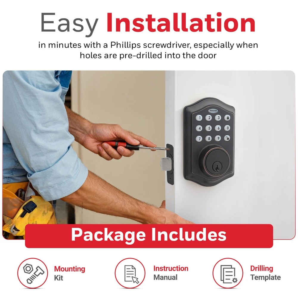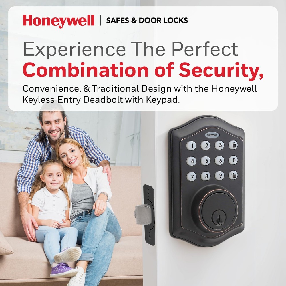Honeywell electronic digital deadbolts feature traditional key access as well as the ability to unlock with a Programmable 4 to 8 digit user code (keyless entry). These Honeywell locks allow the owner to program up to 50 different user codes and delete them as desired. The Honeywell oil rubbed bronze electronic digital deadbolt allows you to set an automatic lock function that will return the deadbolt to the locked position at a programmed amount of time after the lock is opened. There is also a vacation mode that puts the system into a low power consumption state and disables all buttons and functions until the programmer chooses to reactivate the lock. The lock features bump protection, an installation hardware kit and 2 keys, a single cylinder deadbolt, and is easy to install with PHILLIPS head screwdriver. The battery requires 4 'aa’ alkaline batteries (not included). LH Licensed Products, Inc. leverages premium consumer brand power to deliver innovative solutions for unmet and emerging consumer needs around the world. Our products are currently available in over 70 countries across the globe. LH Licensed Products, Inc. is the exclusive licensee and manufacturer of Honeywell Safes, Paper Shredders and Door Locks. Our partner company, Lewis Hyman Inc. began in 1930 as a family window treatment business in New York City. Widely recognized for lifestyle product innovation, Lewis Hyman Inc. has established a tradition of quality and service, spanning three generations and over eighty years of expertise. DIGITAL DOOR LOCKS - install in minutes with pre-drilled holes in the door, all you need is a Philips screwdriver!.Note: Measure your door's backset, cross bore and thickness to ensure you find the right fit. FEATURES - oil rubbed bronze brass electronic deadbolt suits a range of doors and home decor styles. Requires 4 "aa" alkaline batteries VACATION MODE - system into a low power state, disabling all buttons and functions until reactivated SECURE - a convenient -touch locking system, 50 programmable user codes, and an alarm that sounds after four incorrectly entered codes. TRUSTED COMPANY - Honeywell digital door locks provide for your home with a convenient keyless entry function.