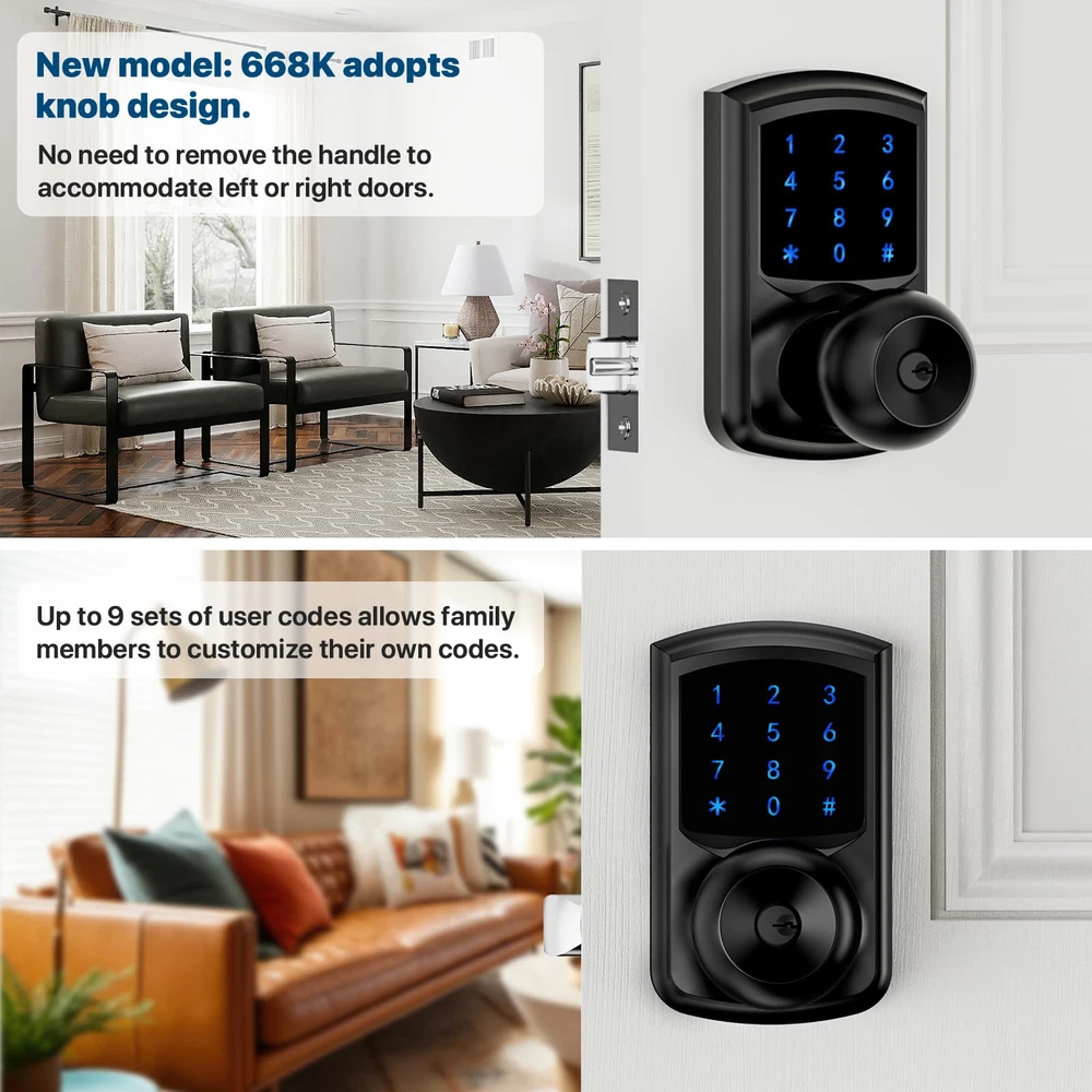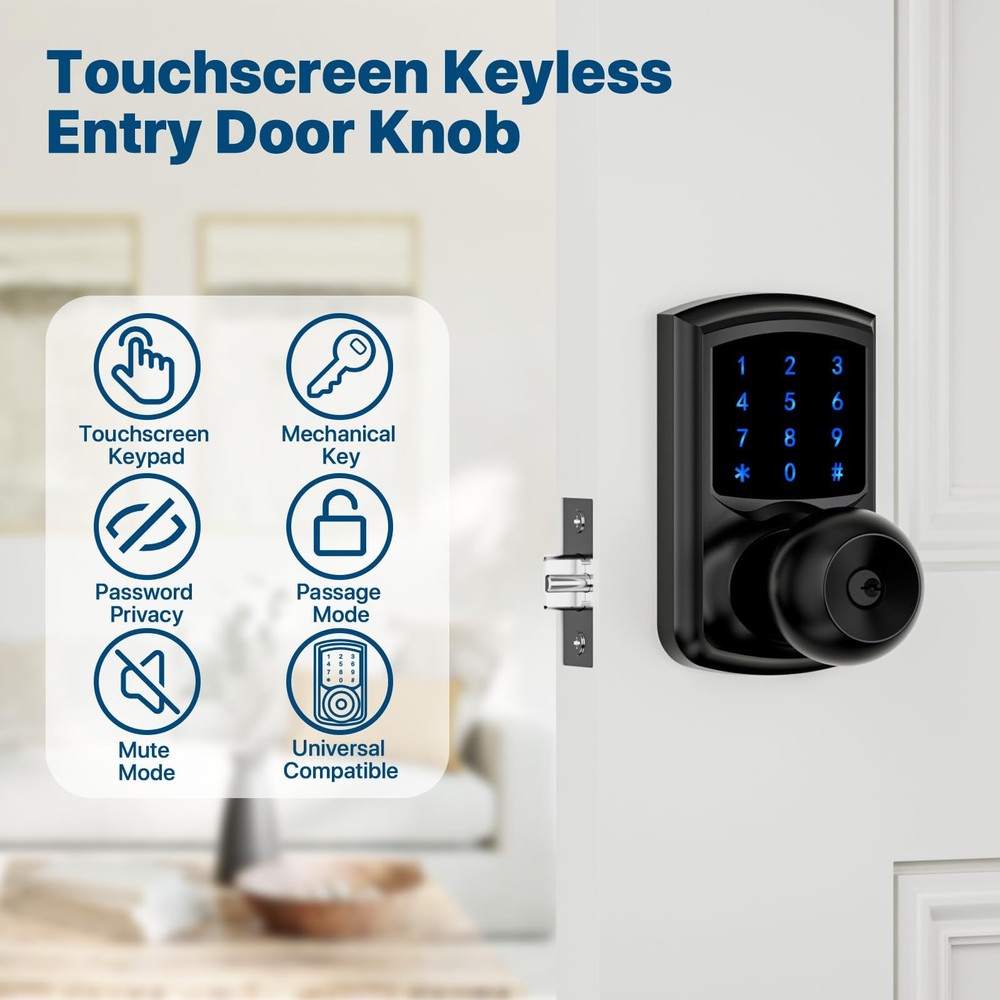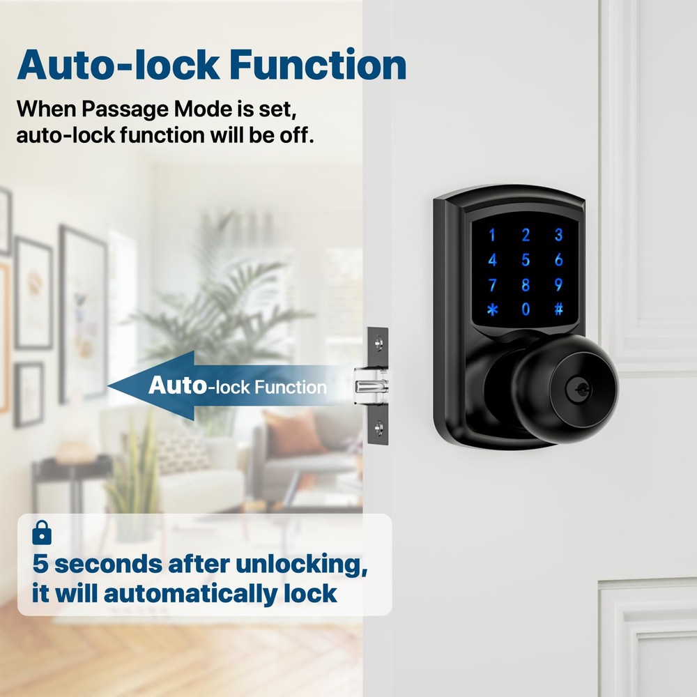 Multi-function: This smart door lock with keypad is also featured with low battery alarm / mute mode / passage mode / 5s Auto-lock(Note: there is NO “one-touch lock” function in interior door knobs). Efficient Touchscreen Keypad: Keypad door lock's touchscreen design ensures optimal performance, eliminating issues associated with stuck physical buttons. Blue Backlight adds to the convenience of password entry even in low-light conditions, making keyless entry easier. Enhanced Security: Keypad door knob automatically secures your home in 5 seconds for peace of mind. Smart door knob with keypad automatically locks 5 seconds after unlocking. No more forget to lock the door. Anti-Peep Password: Prioritizing your safety, keyless entry door lock with handle features an anti-peep password function. Add any random digits before and after correct password with confidence. Password pravicy function protects your password from being leaked. Heavy Duty: Made of Zinc Alloy, heavy-duty door knob with lock meets the same safety standards as ASIN Grade 3. Its locking mechanism is carefully designed to prevent unauthorized access. Effortless Installation: Code door lock includes all necessary hardware and an adjustable latch to fit 2-3/8" or 2-3/4" backsets. Suitable for 2-1/8" (54mm) door holes (don't fit 38mm door holes). Installing on any left or right-handed door is a breeze, taking about 15 minutes with just a screwdriver. No adjustment is required to install door knob on left or right handed door.