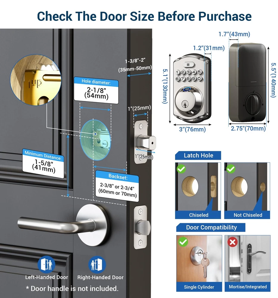 Fingerprint Door Lock recognizes your fingerprint within 0.3 second, and unlocks your door within 1 second. Multiple unlocking methods include fingerprint + passcode + key, make your life safer and more convenient. Includes all the necessary hardware components you need for an easy installation. Always forget to lock your door? Enable Auto Lock for peace of mind, or quickly lock your door on your way out by pressing and hold any single for 2 seconds. More Functions: Support virtual password. Low battery indicator Wrong entry limits. Last over 300 days with 4 AA batteries (not included). Get flashing red lights when batteries are getting low. Two backup keys are included as well, so you’ll always have access to your home. Enter digits before or after your access code to confuse prying eyes. Back-lit keypad makes the numbers readily visible in the dark with just one touch. Keypad is disabled after 10 incorrect access attempts, to ensure your property secured. Specification: Keypad Type: Backlit Push Code Capacity: 20 User Code,1 One-time Pin Code Master Code Length: 4~10 digits User Code: 20 User Codes (4-10 digits) Wrong Code Entry Limit: 10 times Backset: 2-3/8" or 2-3/4" (60 or 70mm) The hole in the door edge: 1" (25mm) Door Prep Size: 2-1/8" (54mm) Door Thickness: 1-3/8" to 2" (35 mm or 50mm) thick The hole in door frame is drilled: ≥1" (25mm) 4 AA batteries required - Not included Apply for all kinds of weather. Built to work under low and high temperature (-31 °F to 150 °F) Advised to be installed under the roof, do not expose it to wet environment. Fingerprint Unlock: Identifies your fingerprint within 0.3 seconds and unlocks your door within 1 second. The biometric fingerprint recognition rate is 99.99% [4-in-1] Unlock: 20 fingerprints, 20 passwords, 2 spare keys for family use, and one-time passwords for temporary visitors. The one-time passwords will be automatically deleted after use Security Locking: "Smart Door Locking" – The door lock auto-locks in 10-99 seconds. Press and hold any key for 2 seconds to activate "One-touch Lock." The rotatable knob allows for locking/unlocking in 1 second from the inside Easy to Install: A screwdriver can complete the installation in a few minutes, suitable for all American standard left- and right-handed doors. ANSI Grade 3 standard certification ensures safety and durability Quality Assurance: offers at least a 1-year warranty and lifetime online phone support from Monday to Friday, 9 AM to 5 PM PST, and 24/7 after-sales email service