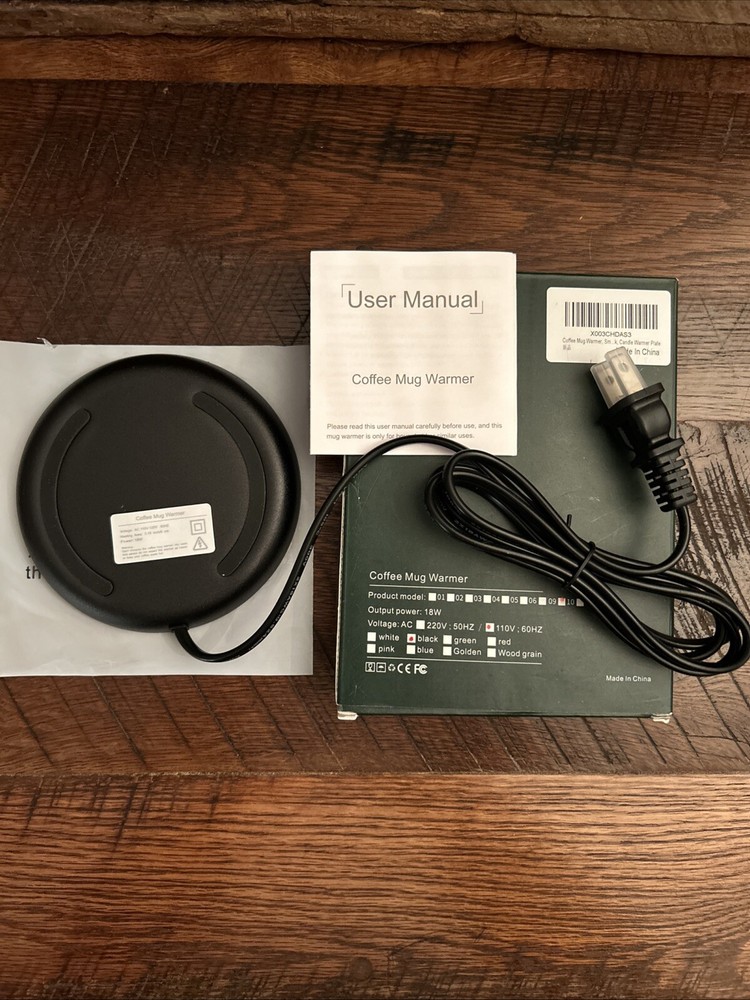 Keep your coffee warm with this Coffee Mug Warmer for Desk. This Smart Cup Warmer is perfect for those who need to have a warm cup of coffee, cup of hot chocolate or hot tea by their side while they work. It has an automatic shut off feature that turns off the warmer after 8 hours of continuous use. Also can be used as a candle warmer! This Coffee Mug Warmer is black and has a plug-in power supply. Model number A202. The temperature range is between 104-140 degrees Fahrenheit. New in box with instructions.