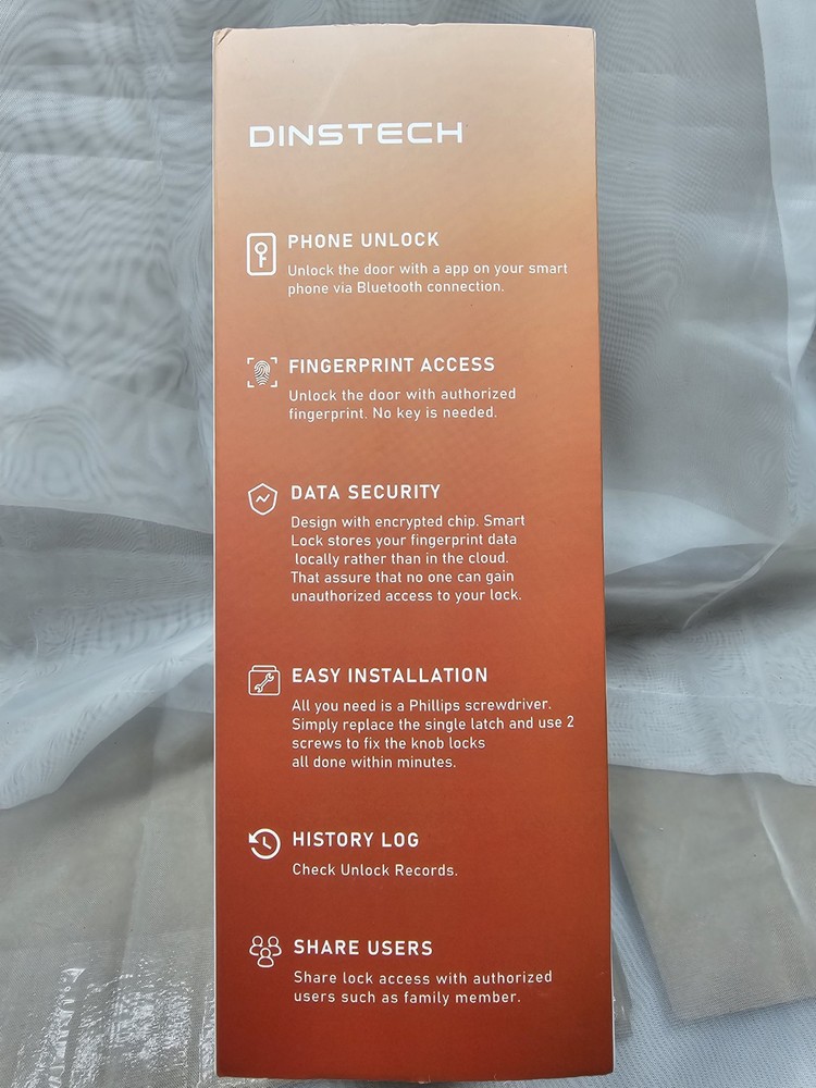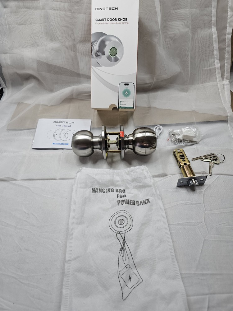 The Smart Door Lock by Dinstech is a modern and convenient security solution suitable for various spaces like bedrooms, apartments, offices, and garages. This universal door lock features biometric technology, key access, and app control for added flexibility and security. The package includes instructions, hardware, and a key, with fixings supplied for easy installation. The sleek silver stainless steel design with a matte finish adds a stylish touch to any door. With rechargeable capabilities and a model number of K10, this innovative door lock offers a high level of security and convenience for users.