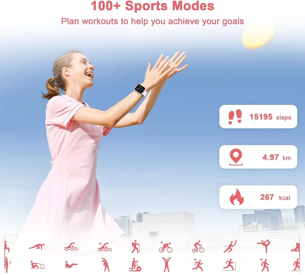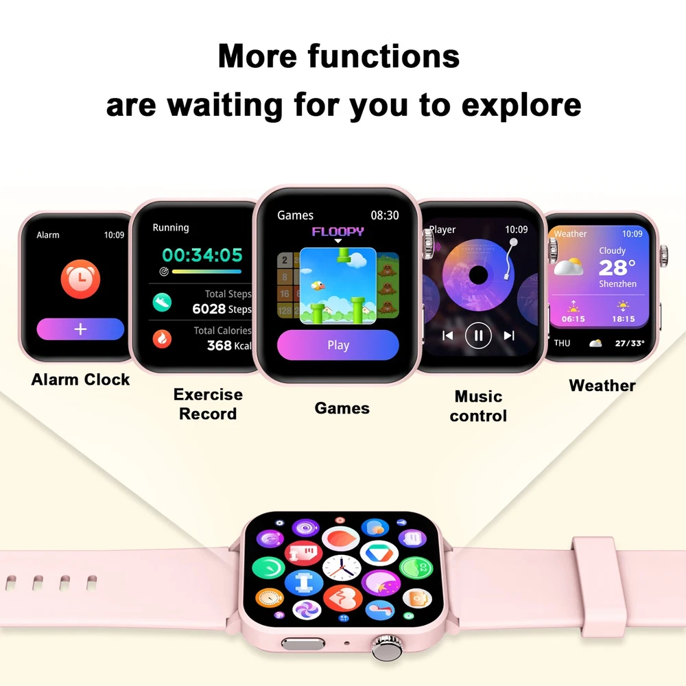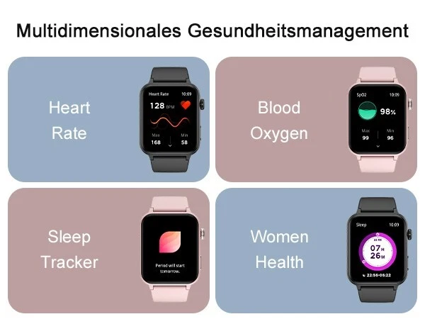 What do you get when you buy this smart watch? 1 * smart watch 1 * silicone band 1 * nylon braided strap 1 * usb charging cable 1 * user manual === Description:=== Resolution: 240 * 284p full hd Screen size: 1.85 inches Battery capacity: 350 mah Net weight of the product: 40g Waterproof grade: ip68 Charge interface: usb2.0 Standby time: 30 days Usage time: 7 days Charging time: 2 hours Mode of operation: full touch screen + buttons Bluetooth effective distance 5.3:20m Support system: android 6.0 and above, ios 9.0 and above Languages supported: Spanish, English, German, French, Italian, Japanese, Russian, Portuguese Watch format: 12/24h, you can change according to your own habits. ===Product description=== Its large 1.85 inch color screen is made of high quality tempered glass, giving you an excellent visual experience. You can control the clock by sliding your finger up, down, left and right, or by holding down the screen. The app comes with over a hundred wallpapers. Of course, you can also download your favorite photo and set it up as a watch screensaver, just lift the wrist to activate the screen easily! The smart watch features ip68 waterproof technology. Whether you sweat or rain, deep water resistant technology effectively protects your watch for a safe use experience; The perfect companion for everyday life. It supports the supervision of hundreds of sports modes, such as running, riding, jumping rope or ball games. You can use the watch to record the status of your exercise at any time. You can record exercise time, distance, calories burned, heart rate, etc., and you will become your close partner when you exercise. Smart watches can monitor your health at any time. You have 24-hour heart rate monitoring and can also measure blood oxygen saturation (spo2) and blood pressure. Both blood oxygen meters and blood pressure meters are on your hands. Apps connected to your mobile phone, with synchronous sleep logs, weather information and information notifications. It also has a sedentary reminder that when you are busy with work and forget about time, it will gently vibrate to remind you to relax your body and mind. 350 mah aluminium polymer battery, superdurable and reliable standby mode. It only takes 3 hours to fully charge and can run continuously for 5-7 days or standby for up to 30 days. At the same time, the clock supports a wide range of android and ios systems. The watch has a green light sensor. When there is a call or a message, it vibrates and it rings. The clock can also call and receive the phone. Supports 100 synchronized contact Numbers. You can also control and play music directly. You can suspend and play the last song or follow the song (you must first open the music player via your mobile phone). In the camera interface, you can take photos remotely. More practical functions like: alarm clock, voice assistant, calculator, mini game, etc., wait until you find out. === Instructions for use=== 1. After receiving the product, check the corresponding charging cable of the product 2. Hold down the side button of the watch for 3 seconds to turn on 3. Scan the qr code or download the app through the app store 4. Connect your bluetooth mobile phone through the app 5. Open the application, switch to the device interface and match the device 6. Start enjoying your time and be happy with your smart watch Legal notice • battery life depends on the use of the product.