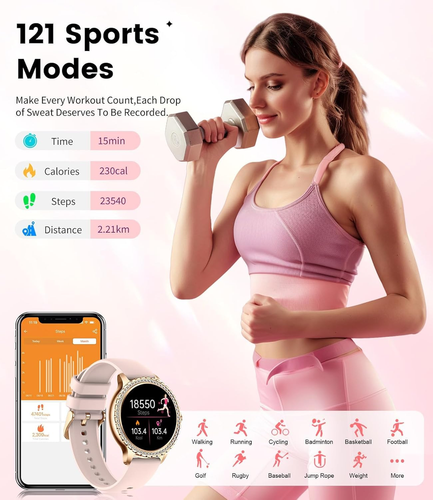 This smartwatch is a game-changer! The HD screen is stunning, and the diamond accents add a luxurious touch. Love the Bluetooth calling feature—so convenient for staying connected. The fitness tracking is accurate, and battery life lasts days. Customizable watch faces and straps make it perfect for any outfit. Lightweight yet durable, it’s stylish and functional. Highly recommend for women who want tech with elegance!