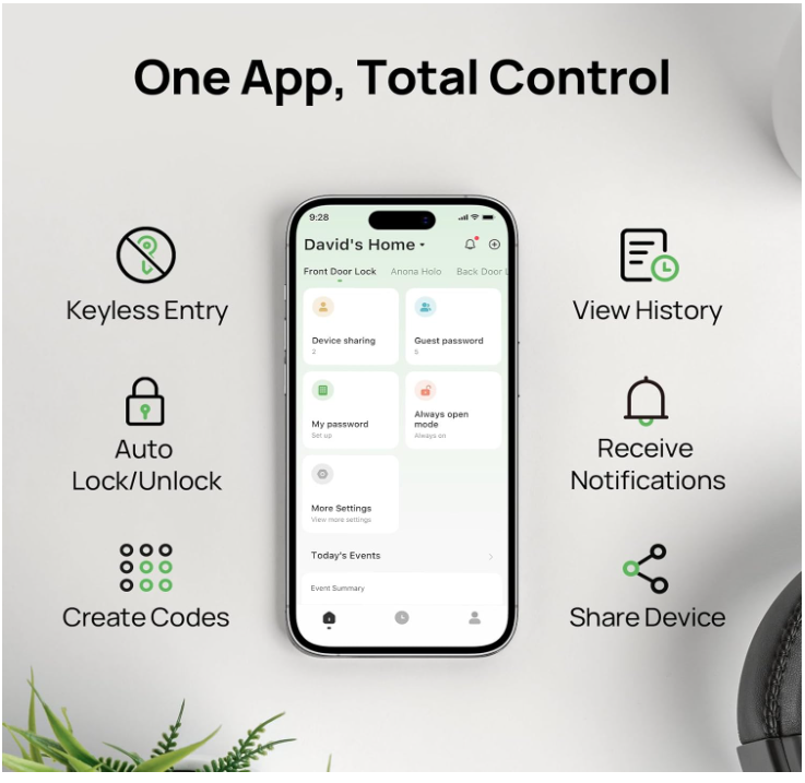 【NO-HUB Matter Ecosystems Support】Anona Holo Smart door lock is compatible with third-party ecosystems like Alexa, Apple HomeKit. Paired with these smart devices, you can easily control your door locks using voice commands, facilitating seamless connectivity within smart home. 【Upgrade Your Deadbolts with Easily Installation】Anona Holo Wi-Fi deadbolt smart locks are compatible with most single-cylinder deadbolts. It can be easily installed on the inside of the door with just a screwdriver, simply making your regular door lock smarter, safer and more convenient. 【Auto-Lock & Anomaly Detection】Never have to worry about whether you've locked your door or not. Anona Holo's built-in inertial sensor can detect closed door status and locks automatically. An alarm will be issued via buzzer or App notification when the lock is jammed or left open for a long time, providing peace of mind knowing you have always secured your home. 【Durable Battery Life】Anona Holo wifi smart deadbolt lock requires only 4 AA batteries to last 4-6 months in standard Wi-Fi mode which includes features such as remote control and real-time security alerts. You can also turn on the low power mode when travelling to extend the usage time. 【Personalized Management】No more leaving keys under the doormat. You can share full home entry with family and trusted friends, or use Anona front door smart lock create temporary or one-time passcodes for guests like dog walkers or babysitters, all from the convenience of Anona App