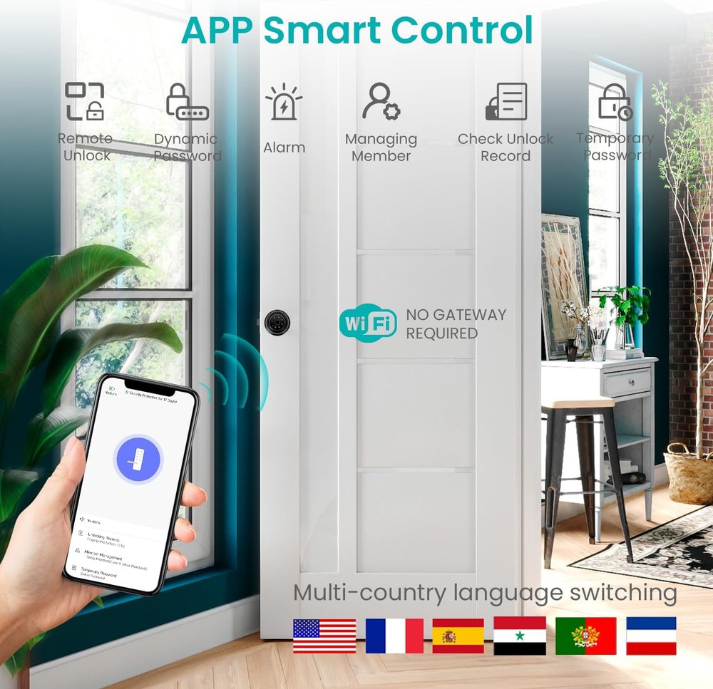Smart WiFi Fingerprint Door Knob, Biometric Lock, 5 Unlock Ways: Black Product Details Brand: Kuelor Special Feature: Fingerprint, Anti-Peeping Password, Auto-Lock, One-Touch Lock, Back-Lit Keypad Lock Type: Biometric, Keypad Item dimensions L x W x H: 3.54 x 2.95 x 2.95 inches Material: Aluminum Recommended Uses For Product: Office, Bedroom, Apartment, Home Style: Wifi-APP Color: Black Number of Pieces: 1 Included Components: IC Card, Key Controller Type: Touch Control Method: App, Touch Connectivity Protocol: Wi-Fi Model Name: Smart Fingerprint Door Knob Manufacturer: Kuelor Part Number: Q7001 Item Weight: 1.52 pounds Product Dimensions: 3.54 x 2.95 x 2.95 inches Country of Origin: China Item model number: DK-Q7 Special Features: Fingerprint, Anti-Peeping Password, Auto-Lock, One-Touch Lock, Back-Lit Keypad Batteries Included?: No Batteries Required?: Yes Brand: Kuelor Special Feature: Fingerprint, Anti-Peeping Password, Auto-Lock, One-Touch Lock, Back-Lit Keypad Lock Type: Biometric, Keypad Item dimensions L x W x H: 3.54 x 2.95 x 2.95 inches Material: Aluminum [5-in-1 Smart Keyless Entry] This fingerprint door lock offers 5 unlock ways: fingerprint, password, IC card, APP, and mechanical key. Press the doorbell to unlock remotely via your phone (requires 2.4GHz Wi-Fi or mobile network). Smart door knob supports voice prompts in six languages, catering to diverse user needs [Emergency Power & Battery Efficiency] Powered by AAA batteries (not included), lasting 6–10 months. Features a low-battery warning and Type-C emergency port, ensuring you’re never locked out due to a dead battery. Reliable backup key ensures 24/7 accessibility [Fast & Secure Biometric Recognition] Advanced fingerprint sensor unlocks in just 0.5 seconds with a 99% recognition rate, supporting up to 100 fingerprints. Auto-lock secures your door 2 seconds after unlocking, preventing accidental entry and enhancing home security [3 Smart Modes] In normal mode, the door will automatically lock after unlocking. Password-free mode is a boon for busy moments, eliminating the need for frequent fingerprint and password entries. Silent mode ensures silent operation and is ideal for returning late at night without disturbing others [Easy Installation & Versatile Compatibility] Designed for standard US doors, this keyless entry door knob is simple to install with a screwdriver. Perfect for apartments, offices, homes, and rentals looking for enhanced security and smart technology