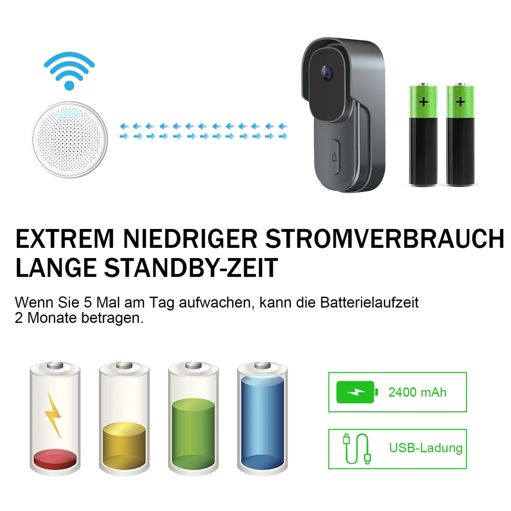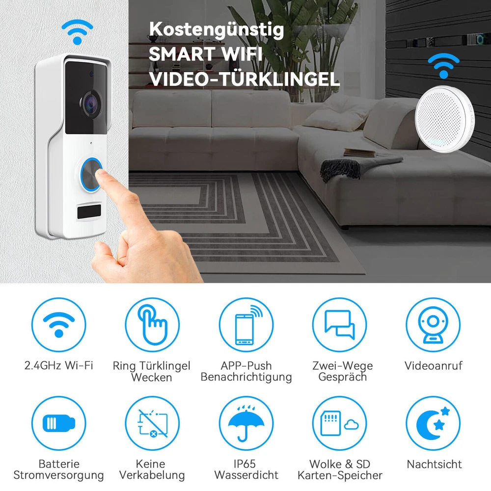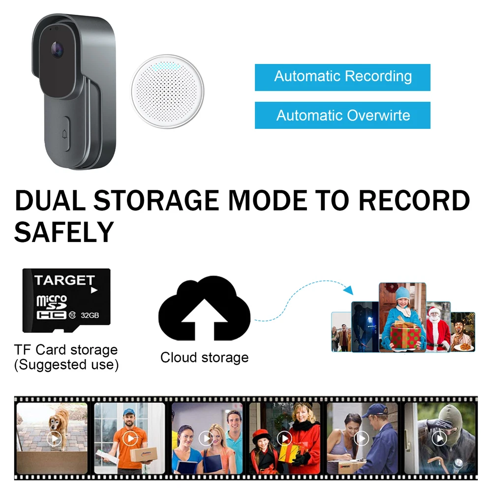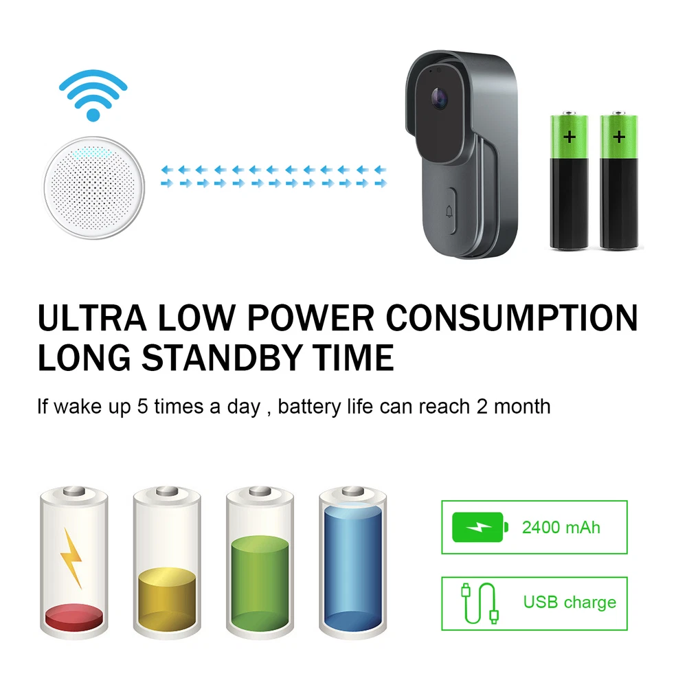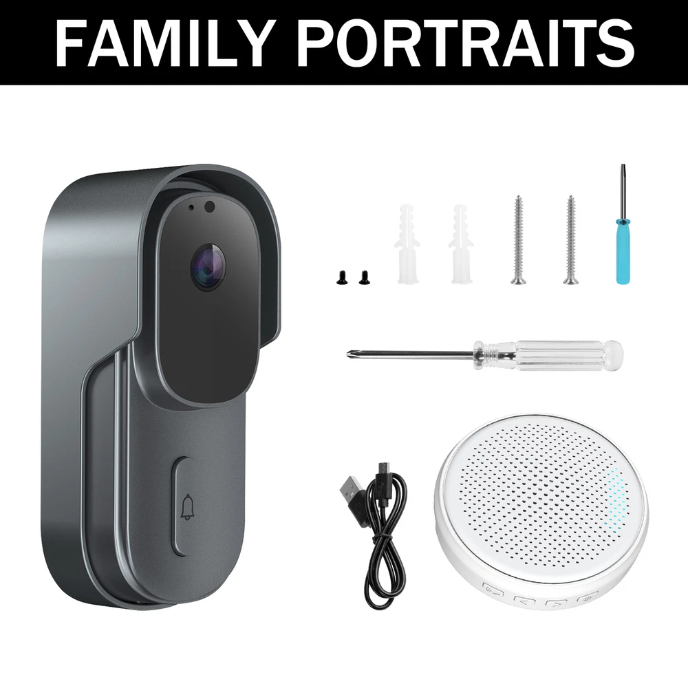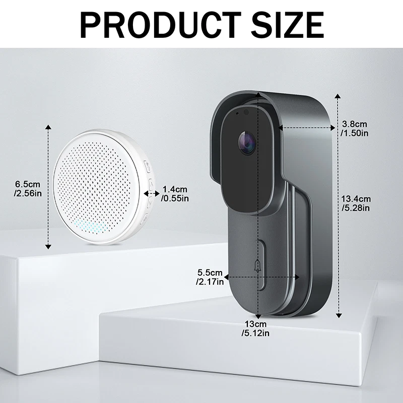 Viewing Angle: 90° WiFi connection: WIFI Support 2.4G WIFI IEEE802.11b/g/n MPN: Does not apply Item Length: 13.4cm/5.28in Finish: Glossy Pixel: 300,000 pixels Battery Included: Yes Items Included: Doorbell Receiver, Battery, Screws, Button Connected Home Protocol: Wi-Fi Consumption: <0.5W Storage: 8G/16G/32G(not included) Style: Modern Video Compression: Standard H.264 Sub Type: Doorbells Product: Smart Wireless Doorbell Model: Doorbells Blue light solids on: camera running correctly Waterproof: IP65 Color: Black/White Year Manufactured: 2023 Features: Portable Bell/Chime, Wi-Fi Connectivity, Waterproof Item Weight: 0.368kg Manufacturer Warranty: 5 Years Network Wifi: 2.4GHz Storage capacity: Storage TF Card (Max. 32G) -Not Included & Cloud Storage Volume: 25-85dB Item Width: 3.8cm/1.50in Power Suppiy: USB 2.0 DC 5V-1A Material: Plastic Connectivity: Wireless Field Of Angle View: 90° Communication Protocol: TCP/IP, HTTP, DHCP, DNS Audio: Two-way talk with noise cancellation Shape: Rectangle Power Source: Battery, Wi-Fi, USB Voltage: 5V Music: 58 Ringtones Brand: ONE Suitable For: Office, Home, School, Shop Resolution: 640x480 Number of Batteries: 2 Type: Door Chime