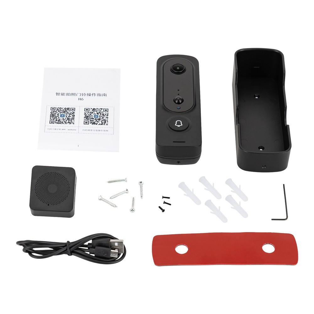 Wireless Door Bell Camera With Chime WiFi Ring Doorbell Security Camera Wifi Description Our visual doorbell adopts advanced wired transmission technology, with stable and interference-free signals, ensuring that every visit is conveyed to you in a timely and accurate manner. Equipped with an ultra-clear camera for day and night monitoring, it can capture every detail of your visitors no matter day or night. In addition, it is made of high-quality materials, durable and sturdy, always standing on the front line of your home security. A safe life starts from choosing this product! Key Features Sturdy and Durable: The product is made of high-quality plastic, using i njection molding technology, with high strength, wear resistance , and long service life. All-rounded Protection: This product can be used not only as a doorbell but also as a monitor. With motion monitoring video, human PIR sensor, motion detection, and night vision infrared function, it will wake up the host and send a message as soon as someone stays down to record the visitor's behavior. It can help you keep an eye on the situation in front of your door and provide all-round protection for your family and house. To ensure all-weather protection, we have used an IP65 waterproof design. It is safe to use in all weather conditions, making it ideal for year-round use. Powerful Function: This product is remotely controlled by Wifi, and the "weihome" APP controls all the functions, it supports remote active wake-up, two-way call, one-way video, photo, video, APP preview video, and other functions, which are powerful and convenient to use. Excellent Performance: It supports auto white balance, auto gain control, and auto backlight compensation, and has a 720P HD 120° wide-angle lens, allowing you to capture every detail of your visitors for worry-free use. The dual filters can switch filters automatically for optimal imaging, whether in daylight or darkness. Embrace Smart Life: AI technology allows it to automatically distinguish the presence of people. The built-in 128G TF card enables cyclic content coverage. You can store records in the cloud for up to 30 days for free, which is enough for your usage. Humanized Design: This product supports 38 kinds of ringtones and supports 12 languages, following the mobile phone language system changes, so that you can choose according to your preference. It allows 8 mobile phones to connect to the doorbell and 3 mobile phones to watch at the same time to share the moment with your family and friends. Two Power Supply Modes: This product comes with 2 rechargeable lithium batteries, 6 hours of charging, 3 months of use, and 6 months of standby time. In addition, it can be connected to a DC power supply to extend the continuous working time. Effortless Cleaning: Thanks to its smooth surface and simple construction, you can easily clean it with a cloth. Easy to Install: Featuring a simple structure, a detailed English manual, and complete accessories, you can easily install it. Nice Gift: This practical product is a great holiday or housewarming gift for family, elders, friends, and lovers so that they can enjoy a more convenient life. Details Rectangular Base: It allows you to install this product more securely. Rainproof Cover: The product comes with a cover that protects it from wind, rain, and sunlight, allowing the it to last longer. Application It is suitable for installation in hotels, homes, apartments, offices, villas, doorman's offices, workshops, and other private or commercial premises. How to Install Download the weihome App on your phone and open it. Follow the steps in the App to connect the doorbell. Set up and enjoy smart video doorbells. Install the smart doorbell in the ideal location. You can mount it with adhesive backing (not included) or screws. Specifications Model: H6 Style: Modern Shape: Rectangular Color: Black Material: Plastic Surface Treatment: Injection Molding Mount Type: Wall Mount Control Type: WIFI Assembly Required: Yes Storage: Free Cloud Storage Communication Interface: Wireless Support OS: IOS, Android Power Supply: DC 5V-1A Standby Current: 120μA Operating Current: 170MA Angle View: 120° Infrared: 6*850nmΦ28Mil Battery: 2*18650 Batteries (Included) Waterproof Rating: IP 65 Night Vision Distance: 10 m/32.81 ft Signal Limit Distance : 10 m/32.81 ft Host Size: 14.65cm*5.05cm*2.83cm / 5.77*1.99*1.11 in Ding-dong Machine Size: 4.45*4.15*2.3cm /1.75*1.63*0.91 in Gross Weight: 0.4kg/ 0.88 lbs Package Size: 17*8*8cm/ 6.69*3.15*3.15 in Package Included 1 * Visual Doorbell 1 * Housing 1 * Ding-dong Machine 1 * Bracket 1* USB Cable 1* Allen Key 1 * English Manual Other Accessories for Installation Notes Please check the size carefully before ordering. Please do not use this product in extreme temperatures. Please note that the factory settings are all in English. Please note that this product should not be used for other illegal purposes. Please read the operating manual completely before use. And pay particular attention to the safety instructions included. Please do not install a doorbell camera on a metal door or metal wall. Please move the device before installation and test the place with the best signal. Please allow the slight color difference caused by the shooting light and 1-3cm error due to manual measurement, and make sure you do not mind before you order. Payment Delivery details Terms of sales About us Contact us Payment We accept ebay payment 。 Fees such as import duties, taxes are not included in the item price or shipping costs. These charges are the buyer's responsibility. Delivery details Shipping: 2-9 working days to: USA Terms of sales We maintain high standards of excellence and strive for hundred percent customer satisfaction. Feedback is very important to us. We hope that you contact us immediately before you give neutral or negative feedback, so that we can address your concerns. It is impossible to address issues if we do not know abo