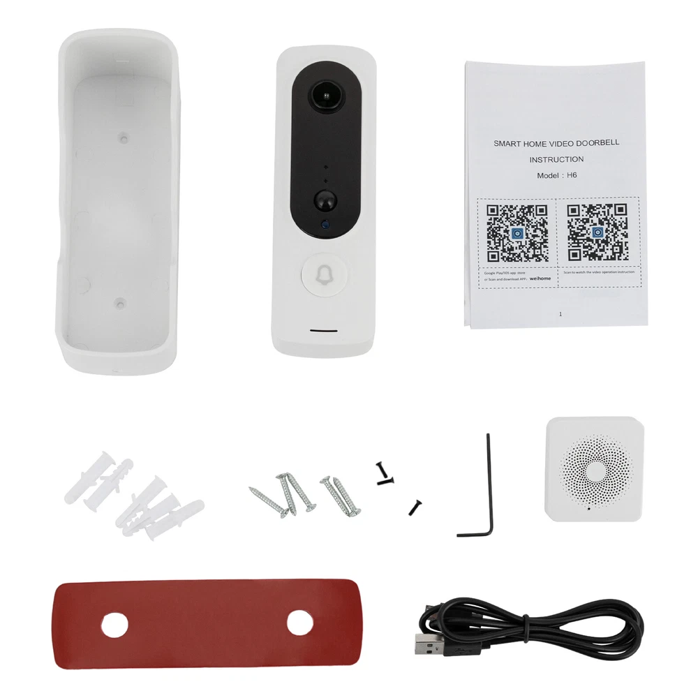 Specifications Model: H6 Style: Modern Shape: Rectangular Color: White Material: Plastic Surface Treatment: Injection Molding Mount Type: Wall Mount Control Type: WIFI Assembly Required: Yes Storage: Free Cloud Storage Communication Interface: Wireless Support OS: IOS, Android Power Supply: DC 5V-1A Standby Current: 120μA Operating Current: 170MA Angle View: 120° Infrared: 6*850nmΦ28Mil Battery: 2*18650 Batteries (Included) Waterproof Rating: IP 65 Night Vision Distance: 10 m/32.81 ft Signal Limit Distance: 10 m/32.81 ft Host Size: 14.65cm*5.05cm*2.83cm / 5.77*1.99*1.11 in Ding-dong Machine Size: 4.45*4.15*2.3cm /1.75*1.63*0.91 in Gross Weight: 0.4kg/ 0.88 lbs Package Size: 17*8*8cm/ 6.69*3.15*3.15 in Package Included 1 * Visual Doorbell 1 * Housing 1 * Ding-dong Machine Smart Wireless Video Doorbell Visual Doorphone Intelligent Visual Doorphone NEW Description Our visual doorbell adopts advanced wired transmission technology, with stable and interference-free signals, ensuring that every visit is conveyed to you in a timely and accurate manner. Equipped with an ultra-clear camera for day and night monitoring, it can capture every detail of your visitors no matter day or night. In addition, it is made of high-quality materials, durable and sturdy, always standing on the front line of your home security. A safe life starts from choosing this product! Key Features Sturdy and Durable: The product is made of high-quality plastic, using injection molding technology, with high strength, wear resistance, and long service life. All-rounded Protection: This product can be used not only as a doorbell but also as a monitor. With motion monitoring video, human PIR sensor, motion detection, and night vision infrared function, it will wake up the host and send a message as soon as someone stays down to record the visitor's behavior. It can help you keep an eye on the situation in front of your door and provide all-round protection for your family and house. To ensure all-weather protection, we have used an IP65 waterproof design. It is safe to use in all weather conditions, making it ideal for year-round use. Powerful Function: This product is remotely controlled by Wifi, and the "weihome" APP controls all the functions, it supports remote active wake-up, two-way call, one-way video, photo, video, APP preview video, and other functions, which are powerful and convenient to use. Excellent Performance: It supports auto white balance, auto gain control, and auto backlight compensation, and has a 720P HD 120° wide-angle lens, allowing you to capture every detail of your visitors for worry-free use. The dual filters can switch filters automatically for optimal imaging, whether in daylight or darkness. Embrace Smart Life: AI technology allows it to automatically distinguish the presence of people. The built-in 128G TF card enables cyclic content coverage. You can store records in the cloud for up to 30 days for free, which is enough for your usage. Humanized Design: This product supports 38 kinds of ringtones and supports 12 languages, following the mobile phone language system changes, so that you can choose according to your preference. It allows 8 mobile phones to connect to the doorbell and 3 mobile phones to watch at the same time to share the moment with your family and friends. Two Power Supply Modes: This product comes with 2 rechargeable lithium batteries, 6 hours of charging, 3 months of use, and 6 months of standby time. In addition, it can be connected to a DC power supply to extend the continuous working time. Effortless Cleaning: Thanks to its smooth surface and simple construction, you can easily clean it with a cloth. Easy to Install: Featuring a simple structure, a detailed English manual, and complete accessories, you can easily install it. Nice Gift: This practical product is a great holiday or housewarming gift for family, elders, friends, and lovers so that they can enjoy a more convenient life. Details Rectangular Base: It allows you to install this product more securely. Rainproof Cover: The product comes with a cover that protects it from wind, rain, and sunlight, allowing the it to last longer. Application It is suitable for installation in hotels, homes, apartments, offices, villas, doorman's offices, workshops, and other private or commercial premises. How to Install 1.Download the weihome App on your phone and open it. 1.Follow the steps in the App to connect the doorbell. 2.Set up and enjoy smart video doorbells. 3.Install the smart doorbell in the ideal location. You can mount it with adhesive backing (not included) or screws. Specifications Model: H6 Style: Modern Shape: Rectangular Color: White Material: Plastic Surface Treatment: Injection Molding Mount Type: Wall Mount Control Type: WIFI Assembly Required: Yes Storage: Free Cloud Storage Communication Interface: Wireless Support OS: IOS, Android Power Supply: DC 5V-1A Standby Current: 120μA Operating Current: 170MA Angle View: 120° Infrared: 6*850nmΦ28Mil Battery: 2*18650 Batteries (Included) Waterproof Rating: IP 65 Night Vision Distance: 10 m/32.81 ft Signal Limit Distance: 10 m/32.81 ft Host Size: 14.65cm*5.05cm*2.83cm / 5.77*1.99*1.11 in Ding-dong Machine Size: 4.45*4.15*2.3cm /1.75*1.63*0.91 in Gross Weight: 0.4kg/ 0.88 lbs Package Size: 17*8*8cm/ 6.69*3.15*3.15 in Package Included 1 * Visual Doorbell 1 * Housing 1 * Ding-dong Machine 1 * Bracket 1* USB Cable 1* Allen Key 1 * English Manual Other Accessories for Installation Notes 1.Please check the size carefully before ordering. 2.Please do not use this product in extreme temperatures. 3.Please note that the factory settings are all in English. 4.Please note that this product should not be used for other illegal purposes. 5.Please read the operating manual completely before use. And pay particular attention to the safety instructions included. 6.Please do not install a doorbell camera on a metal door or metal wall. 7.Please move the device before installation 