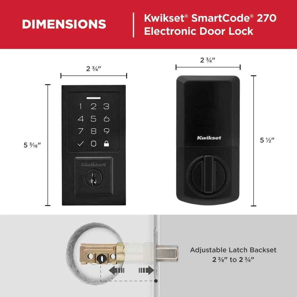 Add a level of style and security to your home with the SmartCode 270 touchpad keyless entry electronic deadbolt. Designed with a sleek contemporary style to complement your home's interior, you can secure your home and never have to worry about keys. To gain entry, simply enter your personalized code, while locking is as easy as the touch of a button. SmartCode is easy to install, program and use and utilizes 4 AA batteries. It also features SmartKey re-key technology as the back-up keyway. The deadbolt is operated by electronic touchpad and key outside and turn-piece inside. The crisp, clean appearance of the Matte Black finish reinforces the deadbolt's modern design. Highlights Convenient keyless entry: touchpad entry makes coming and going secure and simple, easily lock and unlock your door without having to take out your keys Certified advanced security: security, durability and finish are grade 2 BHMA certified, which is up to 2.5x stronger than grade 3 BHMA certified lock sets Auto-lock: enjoy security and peace of mind knowing your door can lock itself, customize it to automatically lock every 30 sec, 1 min, 3 min, 5 min or 10 min 12-month battery life: battery lasts at least 12 months, giving you more time in between battery replacements. uses 4x AA alkaline batteries (batteries not included) Easy code management: customize up to 50 user codes, 10 one-time user codes and 1 programming code that lets you edit or delete user codes whenever you need to Easy install and BILT app: installs with just a screwdriver, BILT 3D interactive instructions provide voice, text and animation guidance for an easy installation Intrusion alert: after 3 consecutive incorrect code entries, the lock sounds an alarm and disables the keypad for 1 min to prevent anyone from tampering with it Vacation mode: activate vacation mode to temporarily disable the keypad, and feel safe knowing no one can operate your door lock when you’re out of town Easy low light code entry: bright LED lights illuminate the touchpad so you can easily enter your user code at night, Simply tap the touchpad to turn on the lights Smartcode deadbolts come with BILT 3D interactive app instructions with voice, text and animation guidance for the easiest installation experience Smartcode deadbolts offer an optional programming code feature for improved access code management where a programming code is required to add or delete user codes Lifetime limited mechanical and finish warranties 1-year limited electronics warranty Deadbolt offers UL certified 20-minute fire rating Smartcode deadbolts are easy to install, program to use and operates on 4 Amper batteries with 12-month battery life (batteries not included) Easily remove the interior cover in seconds to access the batteries or programming button no screws to remove Small interior cover form factor for improved aesthetic 3 incorrect code attempts trigger an audible alarm and 60-second lockout for increased security Audible beep and visual flash when batteries are low power