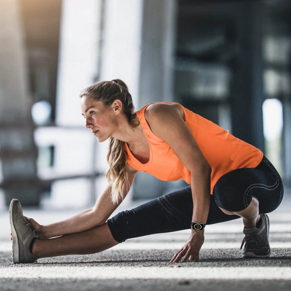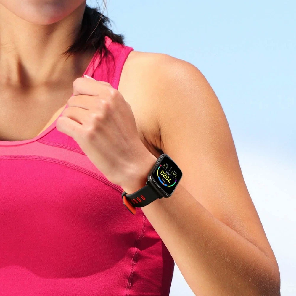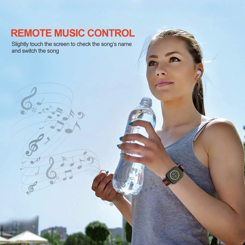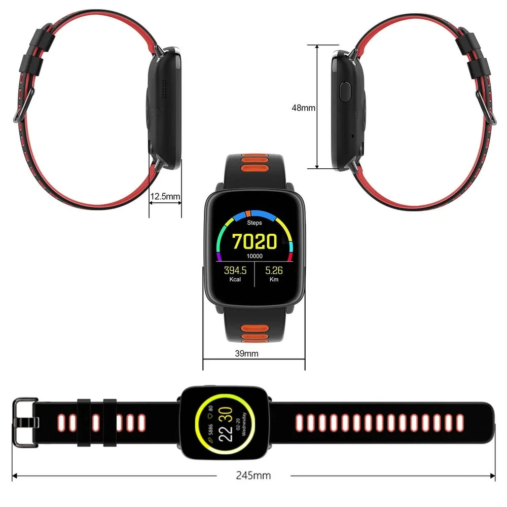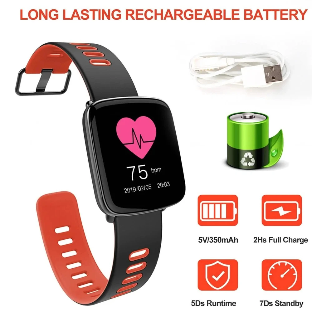 Title Smartwatch Fitness Tracker with Heart Rate Monitor PRODUCT DESCRIPTION Adjust yourself for a healthier lifestyle with our 1.54'' large touch screen fitness smart watch! It can automatically record your all-day activity tracker such as heart rate monitor, pedometer, and sleep monitor as well as provide drink reminder, sedentary reminder, alarm clock function, etc. And, with V4.0 wireless technology, after paring with smartphones with Android 5.0 and above or iOS 8.0 and above system, it can realize functions such as remote camera control, music control, calls-answering/rejecting control, phonebook and call history synchronization, messaging-notifying, smartphone anti-lost, etc. Additionally, it is IP68 waterproof to remove worries about hands washing, splashing, sweating, rainy, etc. And after about 2 hours full charge, it can work approx. 5 days and standby approx. 7 days. Features: 1.54'' LARGE SCREEN SMART WATCH: Owning a 1.54'' large TFT touch screen with 240 x 240 Pixels and big and conspicuous color digital display, our smart watch provides a cozy vision to read time and data clearly and comfortably. RELIABLE REAL-TIME ACTIVITY TRACKER: Can automatically record your all-day activity tracker such as heart rate monitor, pedometer, and sleep monitor as well as provide drink reminder, sedentary reminder and alarm clock function to help you adjust yourself for a healthier lifestyle. (Note: You can synchronize the data to the App which you can download by scanning the QR code in our User Manual after wireless connecting the tracker with your smartphone.) V4.0 WIRELESS CONNECTION TO ENJOY MORE: With V4.0 wireless technology, our smart watch can pair with smartphones with Android 5.0 and above or iOS 8.0 and above system to realize remote camera control, music control, calls-answering/rejecting control, phonebook and call history synchronization, text messaging-notifying function, social Apps information push and notification, smartphone anti-lost function, etc. (Note: Message synchronization through wireless connection only for Android smartphone.) *IP68 WATERPROOF FITNESS TRACKER: Adopting high-grade aluminum alloy materials with metal plating case, powder metallurgy stainless steel lugs and precise external structure design, our smart watch is sturdy, hard and IP68 waterproof to remove worries about swimming, hands washing, splashing, sweating, rainy, etc. (Note: Do not wear in hot bath/shower.) LONG BATTERY LIFE: Built-in 5V 350mAh li-polymer rechargeable battery, after about 2 hours full charge, our smart watch can work approx. 5 days and standby approx. 7 days. Powered by