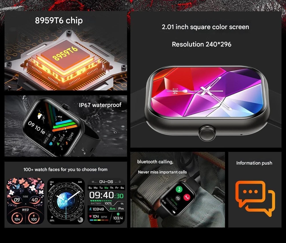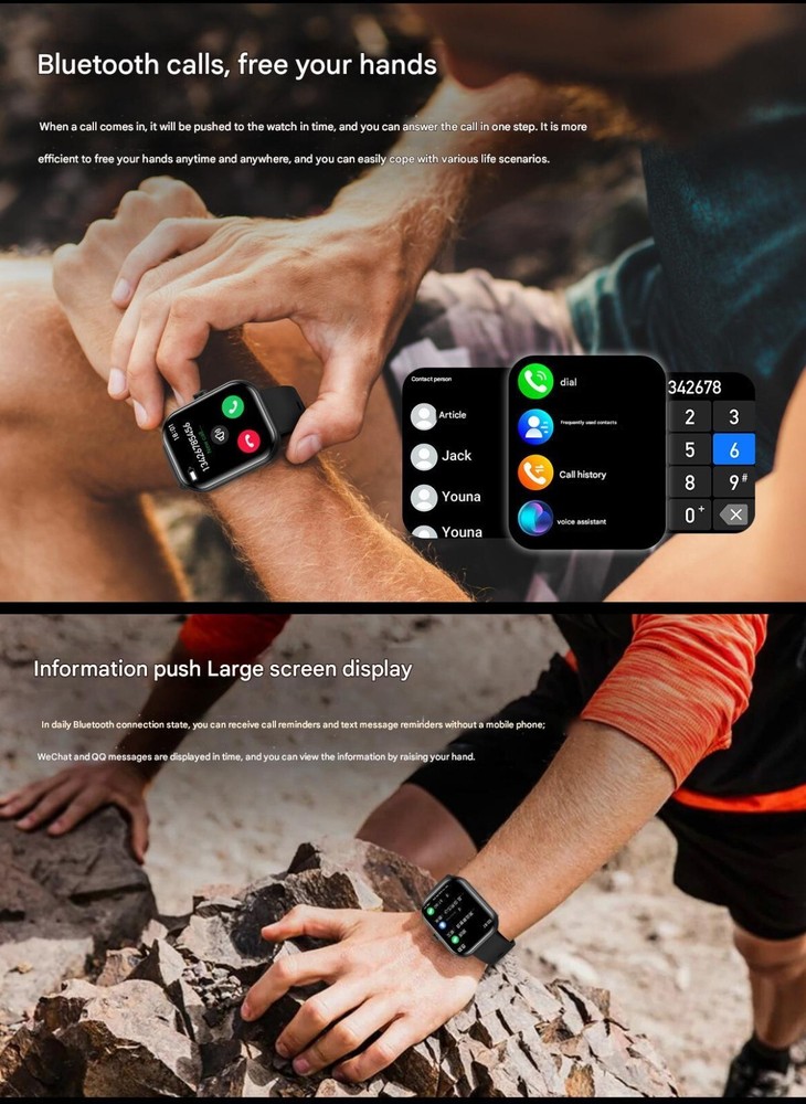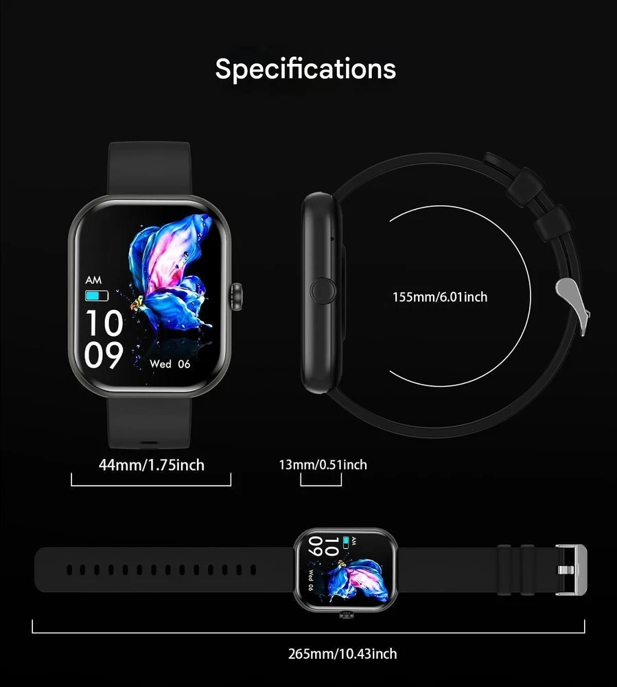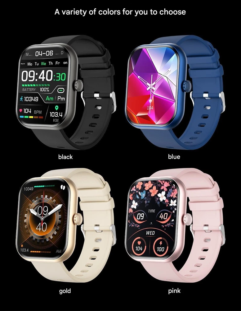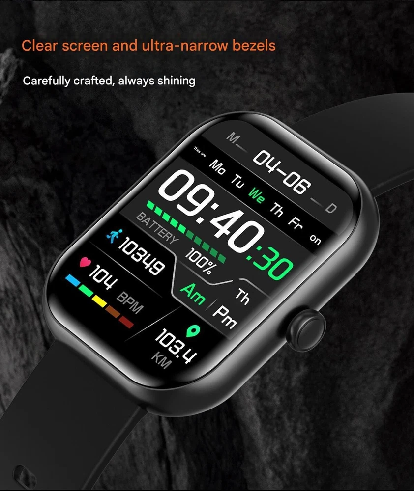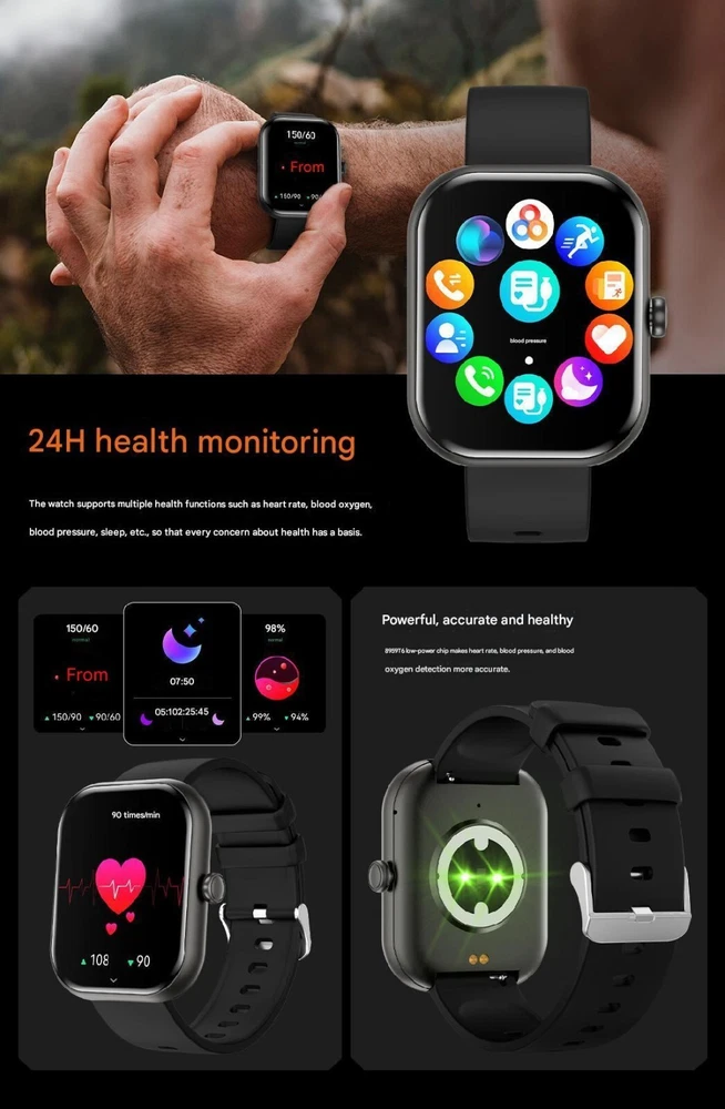 Product Description: Stay Connected and Healthy with This All-in-One Smartwatch This feature-packed smartwatch combines functionality, style, and health monitoring, making it the perfect companion for your busy and active lifestyle. Key Features: Bluetooth Calling: Easily make and receive calls directly from your smartwatch. Health Monitoring: Includes heart rate monitoring, blood pressure tracking, and more to help you stay on top of your health. Smart Notifications: Syncs with your phone to display call, message, and app notifications in real time. Fitness Tracking: Tracks steps, calories burned, and distance to keep you motivated toward your fitness goals. Sports Modes: Multiple activity tracking modes tailored to your workout needs. Sleek Design: A lightweight, ergonomic design perfect for everyday wear. Specifications: Display: High-definition touchscreen for clear and intuitive use. Connectivity: Compatible with both iOS and Android devices. Battery Life: Long-lasting battery for uninterrupted performance. Material: Comfortable and durable design for all-day wear. Water Resistance: Everyday waterproofing for sweat and light splashes (not for swimming). Why Choose This Smartwatch? Combines health, fitness, and smart features in one device. Keeps you connected with notifications and calls at your fingertips. Perfect for tracking your fitness progress and achieving health goals. Empower Your Lifestyle! This smartwatch is ideal for fitness enthusiasts, busy professionals, or anyone looking to stay connected and health-conscious. Whether as a personal gadget or a thoughtful gift, it's a must-have for today's tech-savvy world!