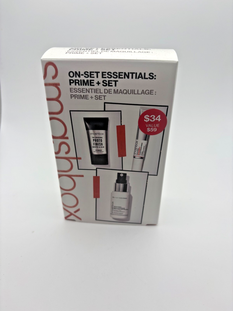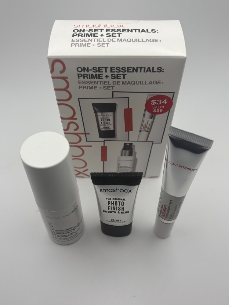 A $59 Value. A three-piece eye and face set from Smashbox for prepping and setting on the go with a full-size eye shadow primer, mini blurring primer, and mini setting spray. Meet the Photo Finish staples: Intensify 24 Hour Shadow Primer intensifies shadow’s color and helps it stay put for up to 24 hours. The Original Smooth & Blur Primer smooths the look of pores and fine lines. Endurance Breathable Setting Spray sets makeup for up to 12 hours while boosting hydration. Vegan and cruelty-free. This Kit Includes: • Full-Size Photo Finish Intensify 24 Hour Shadow Primer: 0.34 fl. oz./10ml • Mini The Original Photo Finish Smooth & Blur Primer: 0.34 fl. oz./10 ml • Mini Photo Finish Endurance Breathable Setting Spray: 1 fl. oz./30ml How To Use: Photo Finish Intensify 24 Hour Shadow Primer • Smooth a thin layer over bare lids or brows. • Let it dry for about 60 seconds before applying makeup. • Studio Tip: Use to tame brows or set brow powder. The Original Photo Finish Smooth & Blur Primer • Smooth a layer over clean, moisturized skin • Let it set for 15 seconds • Wear alone or under makeup • Can also be used over makeup for touch-ups • Studio Tip: Try it in your hair to tame frizzies. Photo Finish Endurance Breathable Setting Spray • Hold bottle 8-10” from face, close mouth and eyes, and mist onto skin evenly. Avoid spraying in eyes. • Studio Tip: Spray in an X motion across the face for even application.