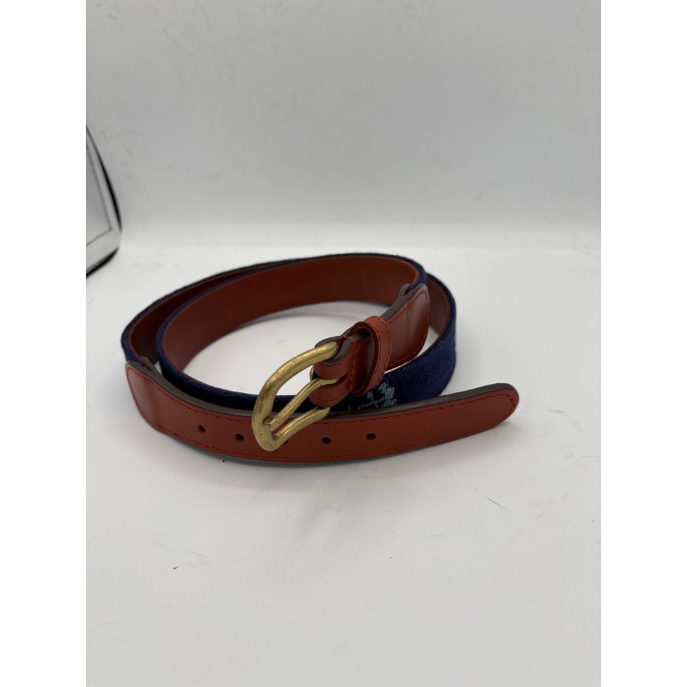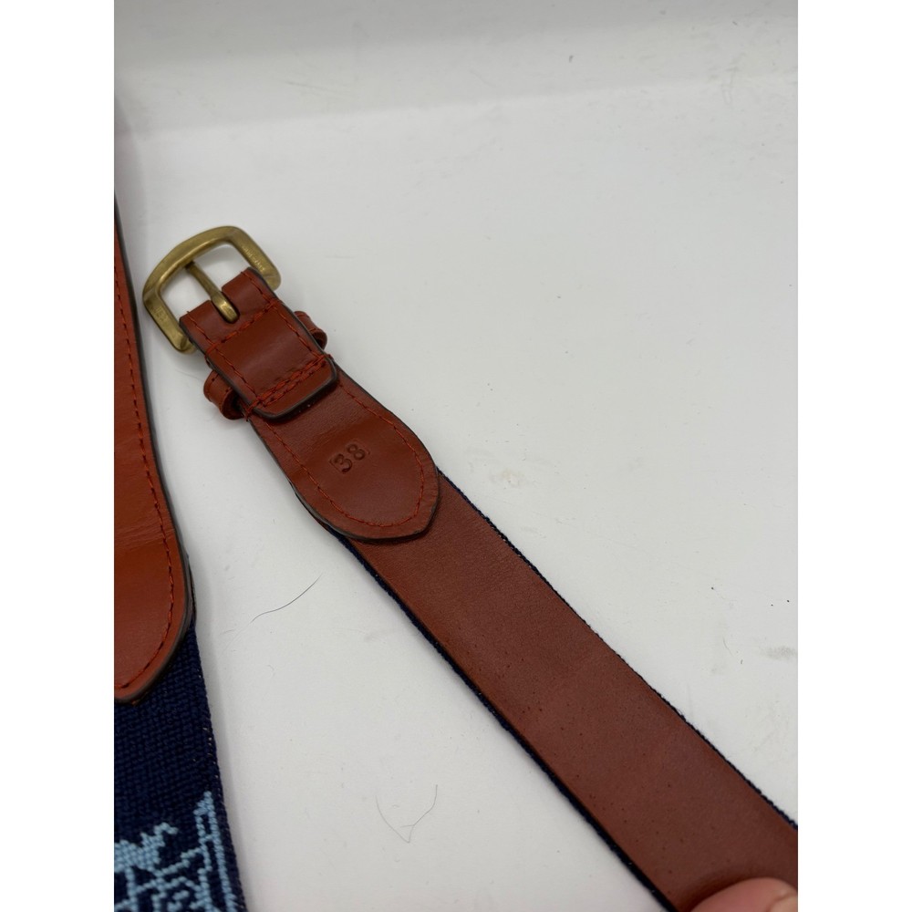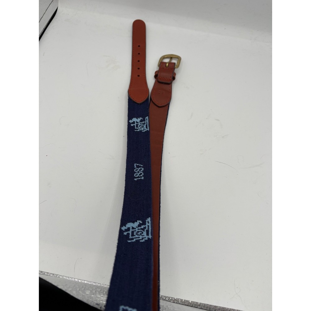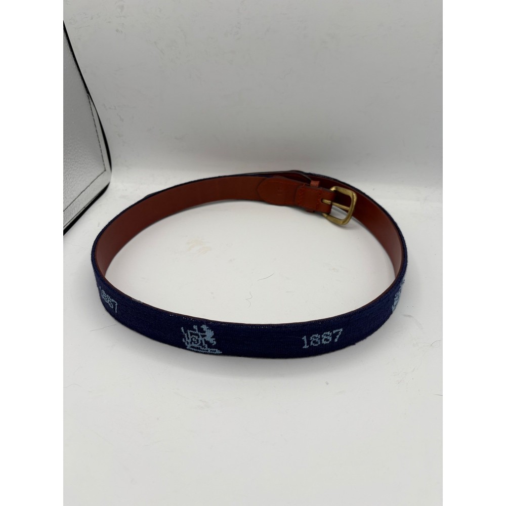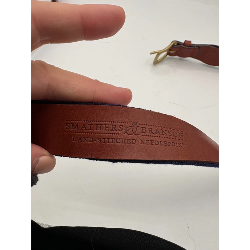 Elevate your everyday style with this distinguished Smathers & Branson hand-stitched needlepoint belt. The rich navy canvas band is meticulously embroidered with the iconic 1887 logo in a tasteful light blue, showcasing a heritage of craftsmanship. Complementing the intricate needlepoint is a smooth, warm brown leather tab and keeper, accented by a classic brass buckle that adds a touch of timeless elegance. This exceptional accessory seamlessly blends tradition with modern appeal, making it a perfect statement piece for any discerning gentleman. Ideal for pairing with chinos for a sophisticated weekend look or adding a polished finish to business casual attire. Measurements: • Waist: 38 in Department: Men Material: Leather, Cotton Style: Braided/Woven Belt, Dress Belt Theme: Preppy Accents: Buckle, Embroidered, Logo Type: Belt Features: Buckle, Adjustable Pattern: Geometric Hardware Material: Brass Country of Origin: United States Unit Type: Unit