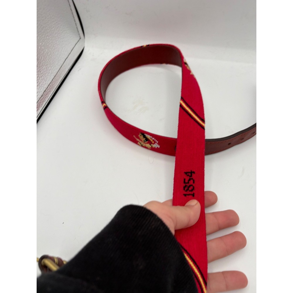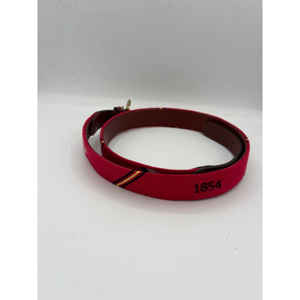 Elevate your ensemble with this distinctive Smathers Branson hand-stitched needlepoint belt. A vibrant red canvas showcases intricate embroidered detailing and the bold '1854' inscription, accented by classic stripes. The rich leather trim and polished brass buckle provide a touch of refined sophistication. Perfect for adding a personalized touch to your weekend casual wear or a smart casual office look. Measurements: • Waist: 38 in Department: Men Material: Leather, Cotton Style: Braided/Woven Belt, Dress Belt Theme: College, USA Accents: Embroidered, Buckle Type: Belt Features: Buckle, Adjustable Pattern: Striped Hardware Material: Brass Country of Origin: United States Unit Type: Unit Keywords: needlepoint belt, embroidered belt, brass buckle, leather trim, preppy, collegiate, sporty, heritage, statement piece, designer belt, classic style, year inscription, striped detail