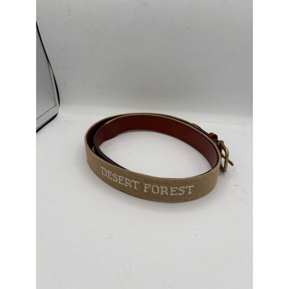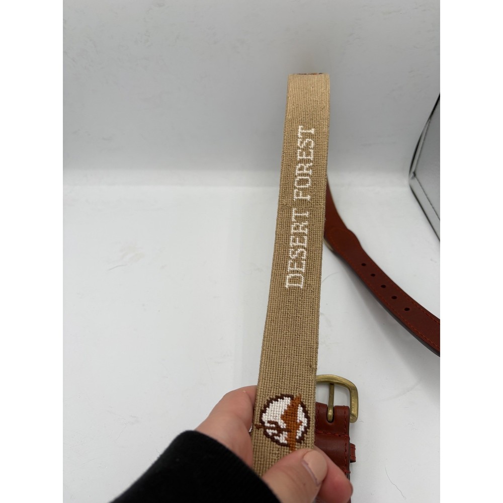 Elevate your ensemble with this striking Smathers & Branson needlepoint belt. Intricate stitching depicts a charming desert forest scene across a durable canvas, seamlessly transitioning to rich brown leather. The classic brass buckle adds a touch of timeless sophistication, making this a perfect accessory for any discerning gentleman. Ideal for a casual weekend outing or a distinguished addition to your work attire. Measurements: • Waist: 38 in Department: Men Material: Hemp, Cotton, Leather Style: Braided/Woven Belt Theme: Animals, Classic, Designer Accents: Embroidered, Buckle, Logo Type: Belt Features: Adjustable, Buckle Pattern: Geometric Hardware Material: Brass Country of Origin: United States Unit Type: Unit Keywords: needlepoint belt, canvas belt, leather trim, brass hardware, embroidered, nature motif, preppy, classic, designer belt, outdoor, heritage, stitched