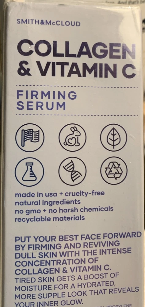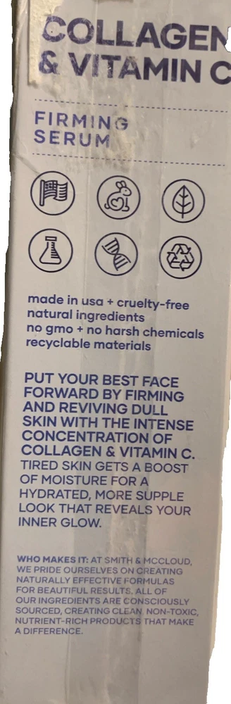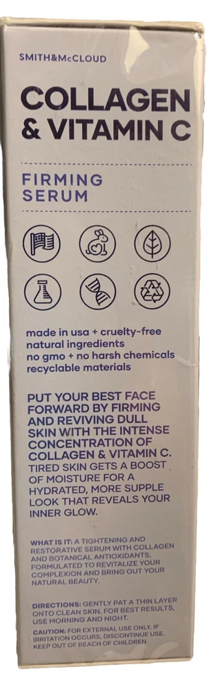 Smith & McCloud Collagen & Vitamin C Firming Face Serum 1 fl oz / 30 ml. New in sealed Box Box has some Sticker residue Full sized 1oz