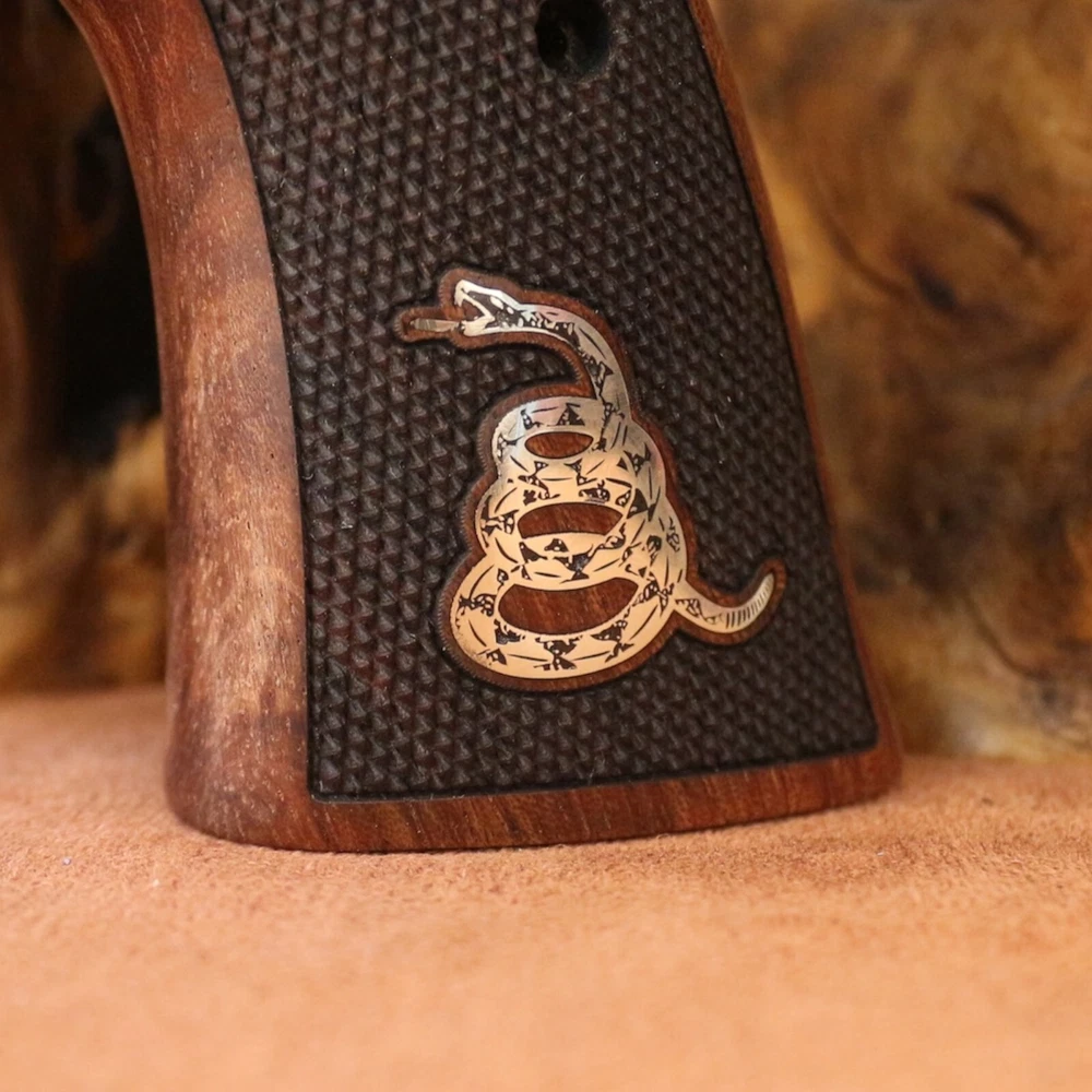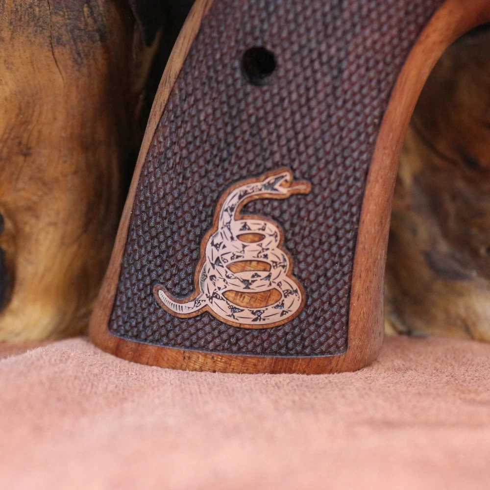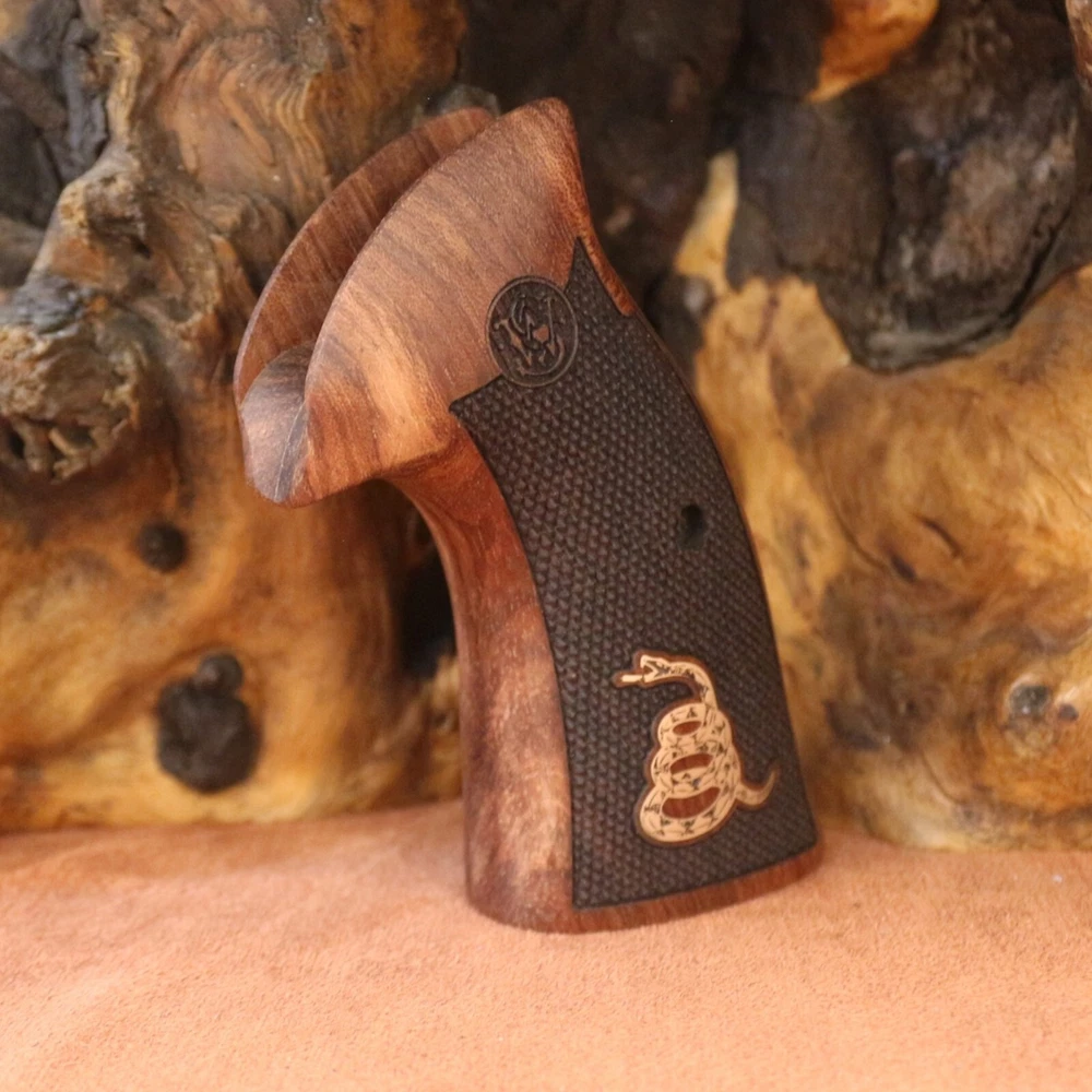 Smith Wesson K L X Frame Round Butt. Compatible Models: 3.57 MAGNUM (Models 10, 12, 13, 14, 15, 17, 19, 64, 65, 66, 67, 69, 242, 296, 386, 396, 460, 500, 520, 547, 586, 617, 619, 620, 646, 647, 648, 681, 686, 696, 986, Governor) Note Not compatible with square butt stock type models. A set of interlocking screws and a set of pins are included to hold the wood tightly together. The wood material of our products is made of high quality Turkish Rosewood and the material of our logos is made of pure brass. Dont Tread On Me Silver Logo All our products are guaranteed for 2 years. Within 60 days you can return the product free of charge.