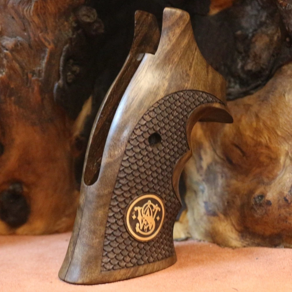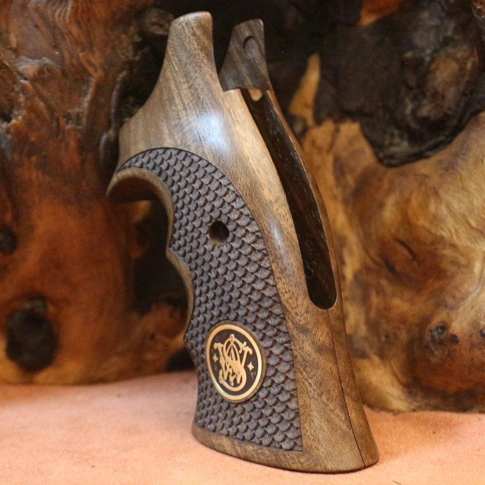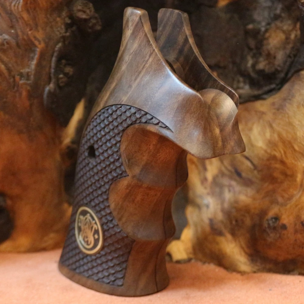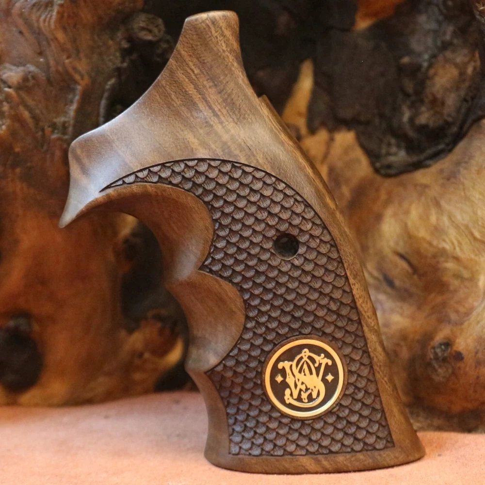 Smith Wesson K L X Frame Round Butt. Compatible Models: 3.57 MAGNUM (Models 10, 12, 13, 14, 15, 17, 19, 64, 65, 66, 67, 69, 242, 296, 386, 396, 460, 500, 520, 547, 586, 617, 619, 620, 646, 647, 648, 681, 686, 696, 986, Governor) Note Not compatible with squarebutt stock type models. A set of interlocking screws and a set of pins are included to hold the wood tightly together. The wood material of our products is made of high quality Turkish walnut and the material of our logos is made of pure brass. All our products are guaranteed for 2 years. Within 60 days you can return the product free of charge.