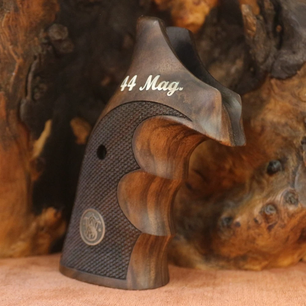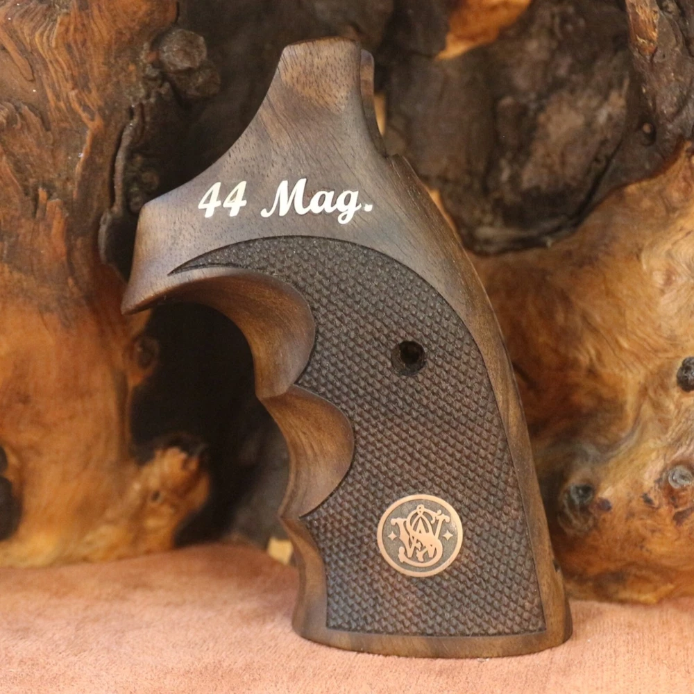 Smith Wesson N Frame Round Butt. Compatible Models: 44 MAGNUM (Models 21, 24, 25, 29, 325, 327, 329, 357, 610, 624, 625, 625, 627, 629, 657, 929) Note Not compatible with squarebutt stock type models. Our handles have a closed back. A set of interlocking screws and a set of pins are included to hold the wood tightly together. The wood material of our products is made of high quality Turkish walnut and the material of our logos is made of silver brass. All our products are guaranteed for 2 years. Within 60 days you can return the product free of charge.