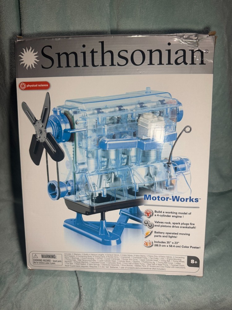 SELLING Smithsonian Motor-Works Gas Engine Model Kit New Open Box Winner of this auction will receive the item(s) as listed and the exact item(s) as shown in the photos. This item is brand new, never used, and never taken out of package. The packaging has minor cosmetic wear from being in storage, all the contents inside are 100% brand new, sealed and complete. Give a budding mechanic a model engine kit that results in a working, battery-powered four cylinder engine with real lights and sounds. Its clear body lets you watch the spark plugs fire and valves open and close. One of the coolest model engine kits around, the Smithsonian Motor Works Kit includes over 100 parts that easily screw together with detailed instructions to help along the way. This toy engine kit recalls many of the machines, motors, and other industrial items found at the National Museum of American History-Behring Center. This engine model is brand new, and is in wonderful brand new condition. Please take in consideration, since this auction has free shipping, the shipping cost comes out of the purchase price. Shipping for a item this size is around $5.00 -$10.00. So please consider this when making purchase. Thank you Please take a very good look at the photos of the item. The photos plays a large part in this auctions item condition. A photo tells a thousand words. Winner of this auction pays for shipping cost.