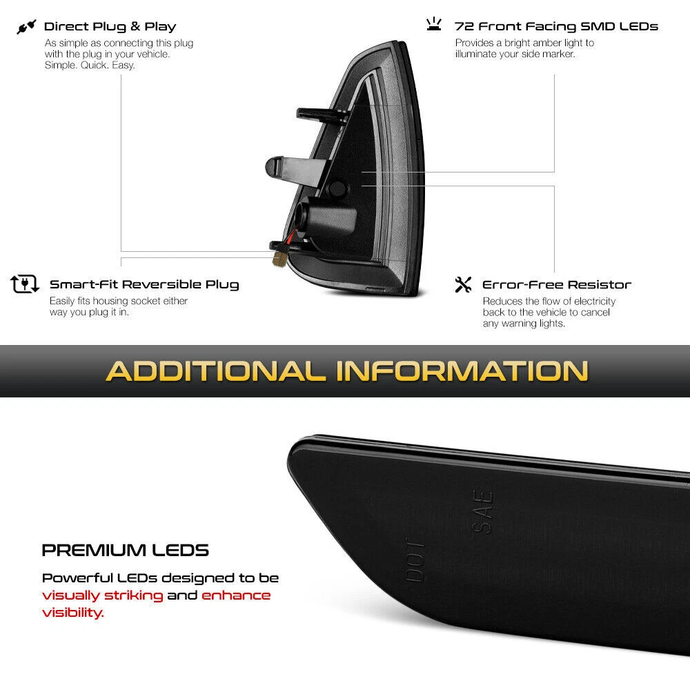 Just installed these dynamic LED side markers on my '08 Charger and they look amazing! The smoked tint gives it a sleek, aggressive look while the bright, flashing LEDs improve visibility. Plug-and-play install was super easy—no wiring mess. The ABS plastic feels sturdy and fits perfectly like OEM. Definitely upgrades the car’s style and safety. Worth every penny!