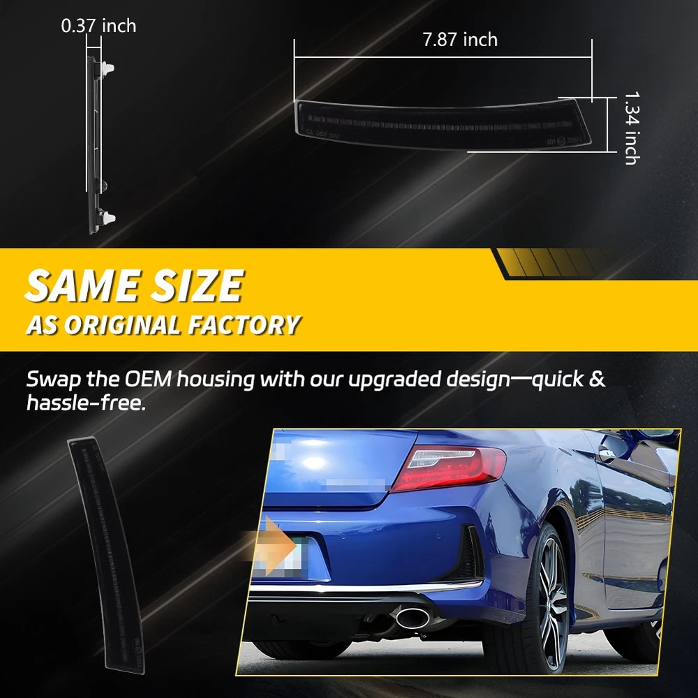 Product Detail Copyright©MotoringPlus Details This page features One Pair (2 Pieces) Smoked / Tinted Lens Sequential red LED Rear Bumper Tail Reflectors Light Kit For 2016-2017 Honda Accord Coupe 2DR These reflectors are made with high-quality Polymethy l Methacrylate (PMMA) and Polycarbonate (PC) plastics 50% Brighter red LED lighting for tail light; 100% Brighter red LED lighting for brake light; Sequential red LED lighting for signal light Give your ride upgraded LED rear bumper lights with an unique and modern look as well as increased safety, visibility, and style at night! Specifications: 100% Brand new and quality Lens Color: Smoked / Tinted LED Color: Red Voltage: 12-24V DC; Power: 4W A complete set of two LED rear reflector lights, replacement for the driver side & passenger sides Compatible With 2016-2017 Honda Accord Coupe 2DR Directly replace or repair your car's rear bumper reflectors with red LED strips CE DOT SAE approved Application: For 2016 2017 Honda Accord Coupe 2DR Please make sure you have available space in your car for these reflectors to fit before placing or der. Package include: 2PCS Driver & Passenger side rear bumper LED reflector Lights (Smoked / Tinted Lens) Installation: To install these LED bumper reflectors, you simply need to access to the back of the rear bumper, push to remove the stock bumper reflectors and directly replace back with these LED reflectors and then tap the wires accordingly. Connect black wire to brake light negative, white wire to tail lights positive, yellow wire to signal light positive and red wire to brake light positive. Note: Professional installation is highly recommended! Returns Policy Shipping Policy Payment Method About US Contact Us Returns Policy Please check actual stock bulb model & housing size before purchasing replacement bulbs. Compatibility list on eBay listing is not a complete list and it is a known issue that there are errors on it. Half year warranty from the purchased date. Please contact us via ebay message before returning the defectived item. Our warranty does not extended to any products that are physically damaged or that are not under normal operating conditions as a result of misuse or improper installation on the buyers/user's part. Return items should include the original packaging and all accessories. Buyers MUST contact us for the returning address. In all cases, buyers pay shipping fees at their own cost to return products for exchange or refund. We will be responsible for the postage of replacements. Refund will be made upon receipt of the returned item. Our goal is to make sure you are a happy buyer and pleasant shopping with us. If you have any problems, please contact us immediately before leaving us any negative or neutral feedback. We understand the concerns and frustrations you might have, and will do our endeavor to resolve the issues. Please give us the opportunity to resolve any problem. Shipping Policy Item will be shipped from China / Hongkong Post by Standard International Post. All orders will be shipped to buyer's paypal shipping address within 24 hours after receiving your verified payment (Excluding Weekends and Public Holidays) International order may takes about 15-25 business day delivery time for most countries. Transactions on weekends or public holidays,item will be sent later on work time. Payment Method We accept Paypal ONLY. Unpaid transaction will be cancelled after 8 days About US Contact Us We are dedicated to providing you the best shopping experience and high quality items at a very low price. If you are satisfied with our service,Please remember to leave us 5 STAR for All Detailed Seller Ratings If you found any problem/issue of our merchandise/service,please let us know before leaving any negative feedback! Please feel free to contact us if you have any question. Any message will be replied within 24 hours. We will try our best to help! Home Payment Shipping About us Contact us Copyright©MotoringPlus Home Payment Shipping About us Contact us Store Categories Store Categories SIDE MARKER LIGHT TURN SIGNAL LIGHT TAIL BRAKE LIGHT LICENSE PLATE LIGHT DECODER OTHERS Other Product Detail Copyright©OFFKAT Why Buy From Us Why Buy From Us Details This page features One Pair (2 Pieces) Smoked / Tinted Lens Sequential red LED Rear Bumper Tail Reflectors Light Kit For 2016-2017 Honda Accord Coupe 2DR These reflectors are made with high-quality Polymethy l Methacrylate (PMMA) and Polycarbonate (PC) plastics 50% Brighter red LED lighting for tail light; 100% Brighter red LED lighting for brake light; Sequential red LED lighting for signal light Give your ride upgraded LED rear bumper lights with an unique and modern look as well as increased safety, visibility, and style at night! Specifications: 100% Brand new and quality Lens Color: Smoked / Tinted LED Color: Red Voltage: 12-24V DC; Power: 4W A complete set of two LED rear reflector lights, replacement for the driver side & passenger sides Compatible With 2016-2017 Honda Accord Coupe 2DR Directly replace or repair your car's rear bumper reflectors with red LED strips CE DOT SAE approved Application: For 2016 2017 Honda Accord Coupe 2DR Please make sure you have available space in your car for these reflectors to fit before placing or der. Package include: 2PCS Driver & Passenger side rear bumper LED reflector Lights (Smoked / Tinted Lens) Installation: To install these LED bumper reflectors, you simply need to access to the back of the rear bumper, push to remove the stock bumper reflectors and directly replace back with these LED reflectors and then tap the wires accordingly. Connect black wire to brake light negative, white wire to tail lights positive, yellow wire to signal light positive and red wire to brake light positive. Note: Professional installation is highly recommended! Returns Policy Shipping Policy Payment Method About US Contact Us Returns Policy Our 60-day Satisfaction Guarantee assures our customers that th