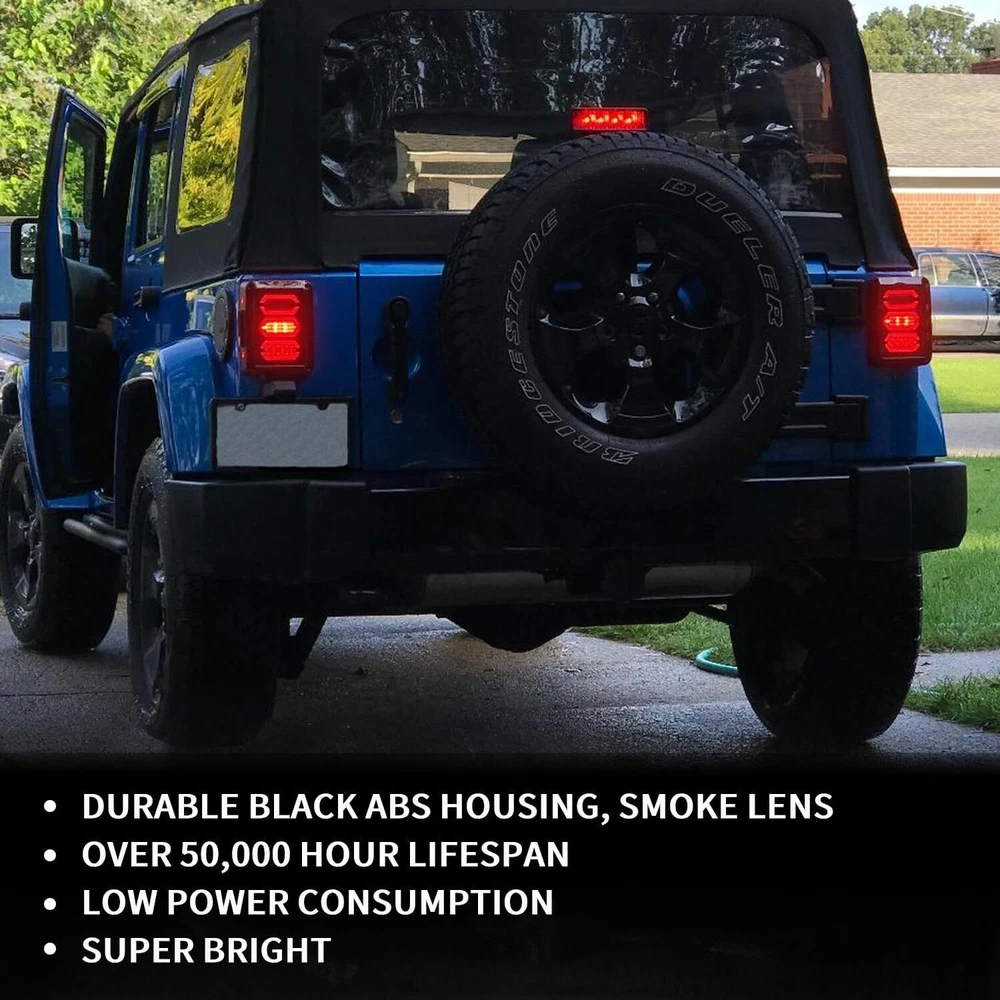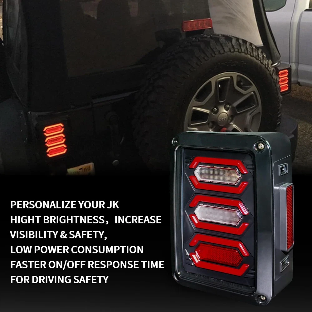 -6pcs item for Jeep Wrangler JK JKU 2007-2018 - 5500 Lumen High Beam / 3600 Lumen Low Beam,105w/pc - US Stock,fast delivery!! Smoke Led Tail Lights +LED 7" Halo Headlights +4“ Fog Lamps Kit for Jeep JK 07+ Description: 2023 New super bright combo kit for Jeep Wrangler JK JKU. - Newest 5D Tail Light Designed for Jeep JK,High Intensive Led Chips ,more brighter than original tail lights,plug and play. - Headlights use High-Performance led lamps,Black durable aluminum housing,shock-proof waterproof(IP68),6500K,More than 80,000 hour lifespan - Strong brightness 105w, 10watts real High Intensive Led Chips , 5600LM for high beam, 4500LM for low beam, more than twice brightness than stock light, safe for road use! - DOT Approved,legal on the road,over 70000 hours above life time.Color Temperature:6000K.Maintenance Free, Water-proof IP68. - Just plug and play,no need to change the original car circuit wires. Usually in 15 minutes or less. Specification: Tail Lights: - EMC: Bulid inside - Power: 30W/pc - IP Grade: IP68 - Input voltage: 9-16v - Lens: Smoke lens - Life-span: More than 80000 hours - Material: Durable black ABS housing, PC clear lens - Certification: DOT, E-MARK - Light Color: Reverse light is white,running light is dim red,brake light/ turn signal light is bright red 7" round headlights: - Luminous Flux: 8000LM@high beam;4800LM@low beam - Input voltage: DC 9-32V - Life-span: Above 80000 hours - Lamp Cup Material: PMMA+ABS - Color Temp: 6000K - Color: White DRL,yellow turn signal - Connector: H4/H13 - Wattage: 105W/pc - IP Grade: IP68 Fog Lights: - Operating voltage: 12-24V - Current: DC 0.75A - Out power: 30W/pc - Luminous flux: 1880LM - Waterproof: IP68 - LED chip: High Intensive Led Chips - Color temperature: 6000k - Material:Aluminum+Toughed Glass+Plastic - Life-span: more than 70000hrs Fitment: For Jeep Wrangler 2-Door JK 2007-2017 For Jeep Wrangler Unlimited 4-Door JK 2007-2017 Pacakge included: pair 7" led headlights pair turn signals Pair Tail lights Warranty: 5 years