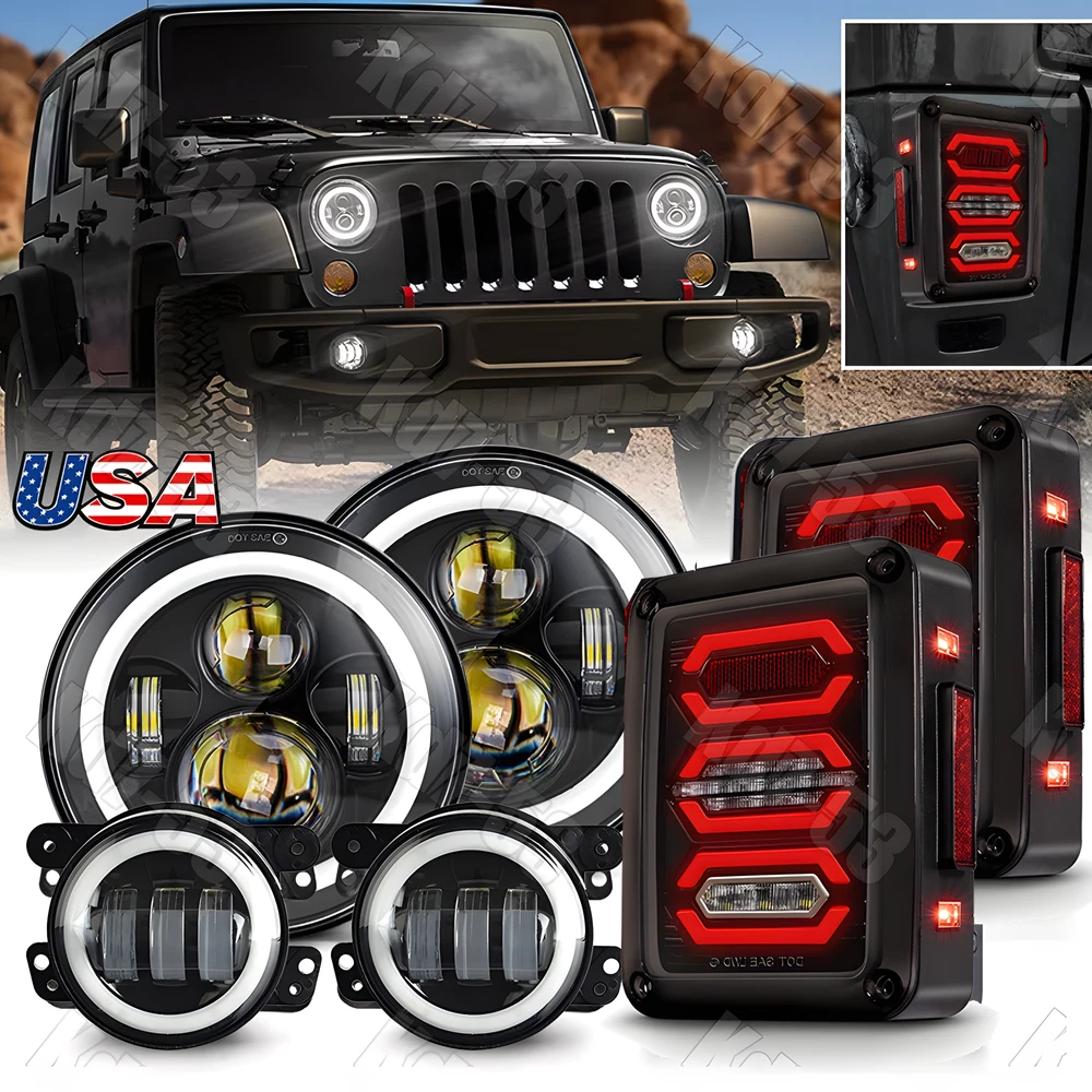 Smoke Led Tail Lights +LED 7" Halo Headlights +4“ Fog Lamps Kit for Jeep JK 07+