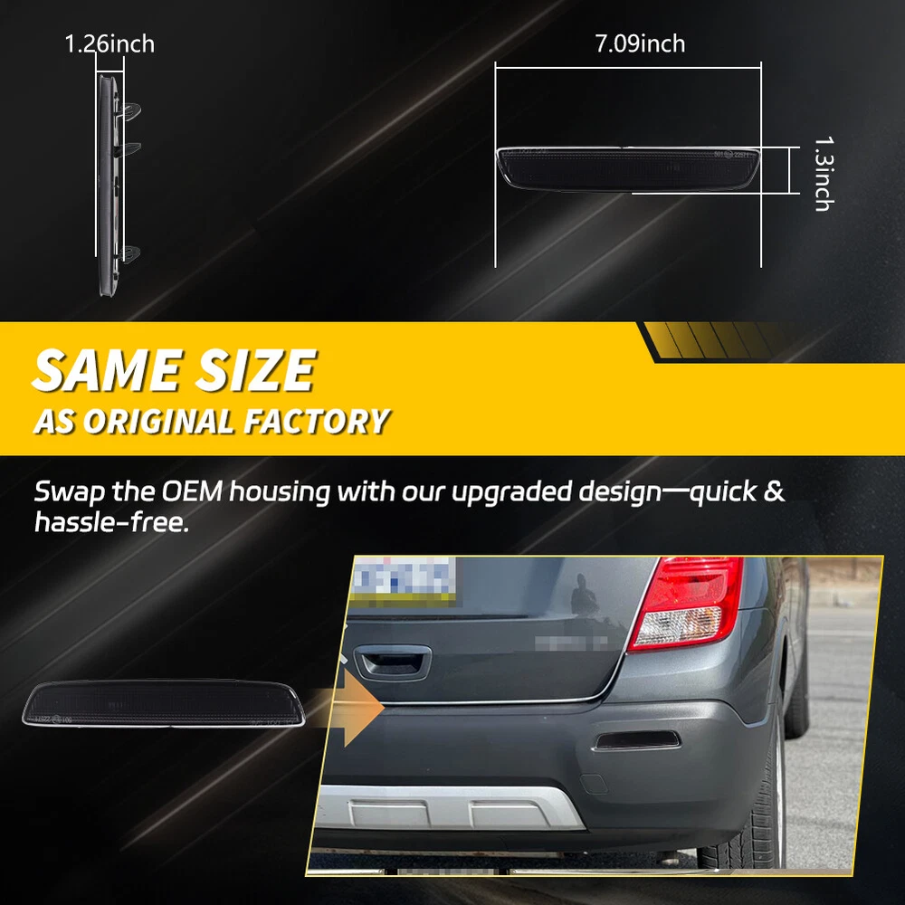 These smoked tail reflectors are a sleek upgrade for Chevy Trax and GMC Terrain owners! The OEM fit makes installation a breeze—no cutting or drilling needed. The high-quality PMMA/PC plastic gives a premium, modern look while maintaining durability. Perfect for adding a subtle, aggressive touch to your ride. Just note that bulbs and adapters aren’t included, so grab those separately. Love the instant style boost!