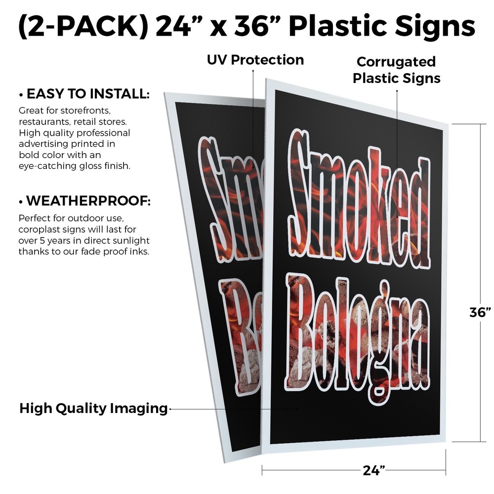 Smoked Bologna (2-Pack) 24 Inch x 36 Inch Plastic Signs | Sign Insert 4mm Corrugated Plastic Signs Storefront Window Poster | Freshly Cooked, BBQ Favorites, Delicious Treats | Made in USA Universal 2 eBay Template by Finest Design Vinyl Banners Aluminum Signs Safety Signs Yard Signs Designer Aluminum Signs Novelty Signs Vinyl Banners Aluminum Signs Safety Signs Yard Signs Designer Aluminum Signs Novelty Signs Description Smoked Bologna Heavy Duty A-Frame Sidewalk Sign Freshly Cooked BBQ Favorites SignMission Deluxe A-Frame Signs Heavy-Duty - Portable - Reusable - Weather Resistant A-Frames, also known as sandwich board signs, are an easy and affordable way to advertise your business or event. The durable thick plastic frame allows them to be placed both indoors and outdoors in any conditions except extreme weather. They are also extremely easy to set up, take down, and move from one location to another as needed. Our Signicade Deluxe A-Frame is available with two installation options: Decals Installed – The sign graphics are printed on high-quality vinyl decals that come pre-installed on the frame. Corrugated Plastic Signs Installed – Includes two 4mm corrugated plastic sign inserts that are attached using self-adhesive Velcro (included). Need to switch up your messaging? Extra sets of inserts are available in both decal and corrugated plastic options. Order multiple sets and change your message in just a few minutes! Simply search for SignMission 24” x 36” sign inserts to get additional replacements. Product Features & Specs (2) 4mm Corrugated Plastic Signs OR Pre-Installed Decals Self-Adhesive Velcro (For corrugated plastic option) White Heavy-Duty Frame 18 lbs. + 10 lbs. if Sand/Water Added 24” x 36” Removable Sign Graphics Indoor / Outdoor Use Double-Sided A-Frame Features Weatherproof: The combination of high-quality plastic and added weight from sand/water makes these signs perfect for outdoor use. Rain or shine, your A-Frame sign can endure it all. Maximum Visibility: Because every A-Frame is double-sided, you can make sure everyone sees your message. Portable: The collapsible A-Frame and convenient handle make it easy to move your sign from one location to another. Reusable: Store your signs and use them as you always have, swap inserts to change your messaging, and use your A-frame signs for years to come. Weight: 18 lbs. (Weight does not reflect when the frame is filled with water or sand, which can add 10 additional lbs. when full.) Details: Durable heavy-duty plastic frame with a regressed double-sided sign area (24”x36”). Foldable with a molded handle for easy grip and carrying. Fillable frame for greater stability. Swappable corrugated plastic graphics or pre-installed decals. Portable. Uses: Indoor/Outdoor. Trade shows. Sidewalk advertising. Daily specials and menus for restaurants. Point-of-purchase displays. Event and foot traffic. Directional signage. Estimated Lifespan: 5+ years with proper placement and care. Size: 45"H x 25"W x 3"D - Frame; 24" x 36" Graphic Area.