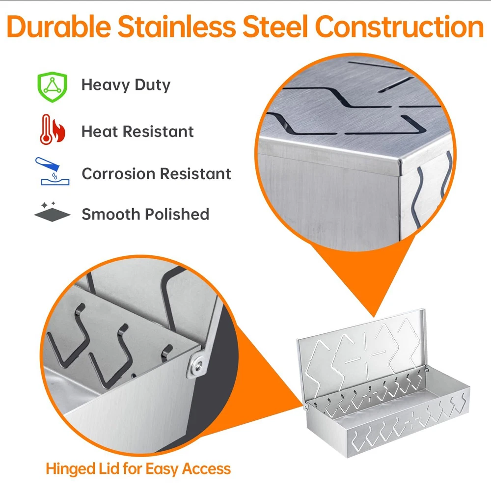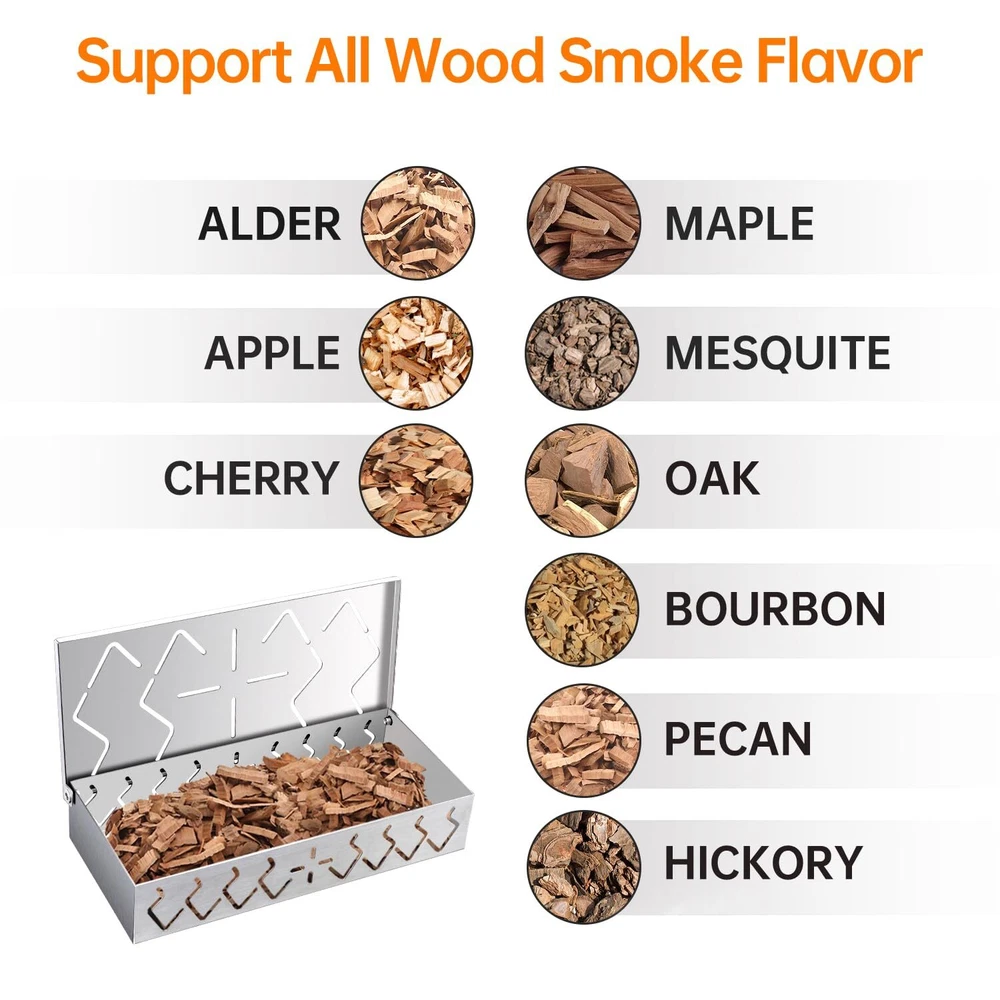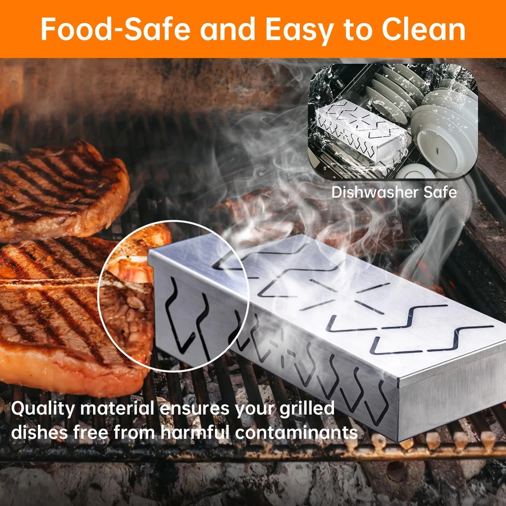 Versatile Usage and Combination: Set of 2 packs, large smoker box measures 9.8"D x 4.5"W x 2"H, small smoke box measures 8.75”D x 3.85”W x 1.64”H. The two different sizes are available in a variety of uses and combinations, perfect for all gas grill, charcoal grill and electric grills. When not smoking, you can take the smoker box for gas grilling off the grill to have a full grill top to cook more food Sturdy Structure and Food-Safe: The smoke boxes for gas grill have durable stainless steel construction. Heavy duty, heat and corrosion resistant, not easy to warp, bent or rust. The grill smoker boxes are food-safe to ensure that your grilled dishes are free from any harmful contaminants Offer Tantalizing Smoky BBQ Flavors: The unique hollow design not only enhances the aesthetics of the smoke box, but also provides great ventilation which helps to produce a lot of smoke and give off a fantastic smoky flavor. You can choose your favorite wood chips flavor, and enjoy delicious smoked meat like chicken breast, beef and ribs Easy to Use and Clean: The secure but simple hinge design allows you to easily add wood chips and adjust smoking intensity. The gas grill smoker box is super easy to clean with a polished surface and smooth edges. The wood chip smoker boxes for gas grill are also dishwasher safe, making cleaning a breeze Large Capacity & Great Service: The two smoker boxes for gas grill provide enough space for more wood chips, avoid adding wood chips while grilling. Each smoke box for pellet grill is well packaged and carefully inspected before shipment. If there is any problem with the gas grill accessories you received, please feel free to contact us. We will provide you with satisfactory solutions within 24 hours.