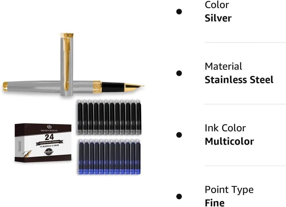 Smooth Writing Fountain Pen with Fine Nib - Includes 24 Ink Cartridges ‹ › ‹ › ‹ › ‹ › ‹ › ‹ › ‹ › ‹ › ‹ › ‹ › ‹ › Smooth Writing Fountain Pen with Fine Nib -Includes 24 Ink Cartridges Features: Slim, elegant design with perfect weight/comfort ratio for a relaxed and graceful writing experience. Ergocomfort technology for hours of uninterrupted writing without strain to your wrist or hand. Hooded, fine nib produces a 0.5 mm smooth and elegant line. No more skips or blotches. Beautiful slim design for a statement of sophistication. Designed to accommodate left-handed writers. 100% satisfaction guarantee - no-hassle refund if not delighted. Benefits: Relaxed and graceful writing experience Precision and sophistication in your writing No more skips or blotches Make a statement of sophistication Confidence to express your own style Refined writing experience Risk-free purchase with 100% satisfaction guarantee Exceptional customer service Why choose our Smooth Writing Fountain Pen? Experience the perfect balance of elegance and comfort with our Smooth Writing Fountain Pen. Designed with ergocomfort technology, this pen allows you to enjoy hours of uninterrupted writing without any strain to your wrist or hand. The hooded, fine nib produces a smooth and elegant line, ensuring precision and sophistication in your writing. No more skips or blotches to ruin your work. But it's not just about functionality - our fountain pen also boasts a beautiful slim design that exudes sophistication. Twist off the cap and let the world see your refined taste. As a family-run business, we prioritize our customers and guarantee 5-star service. If you're not 100% satisfied, we'll buy the pen back from you with no questions asked. Don't settle for ordinary pens - choose the Smooth Writing Fountain Pen for a truly exceptional writing experience. Order yours today! Shipping Free & Fast Shipping - We offer free shipping to most of the USA with a normal delivery time of 3-7 days. However, due to the current situation, additional delivery time (up to 3 weeks) may be required for some items. Alternative Carriers - We may use alternative carriers (e.g. USPS, FedEx, UPS, etc.) to ensure your package arrives safely and on time. Due to the use of multiple carriers, we are unable to provide a tracking number automatically. Handling Time - Orders are processed and shipped within 1-2 business days of receiving cleared payment. Shipping Restrictions - Shipping to Alaska, Hawaii, Puerto Rico, Guam, and other US territories may incur shipping charges or delivery restrictions. Please contact us before ordering, or your order can be refunded/cancelled. State Restrictions - There may be restrictions based on your state of purchase. For example, certain items may not be shipped to California due to state regulations. Contact for Tracking Updates - If you require tracking updates or have any concerns about the delivery of your order, please feel free to contact us, and we will be happy to assist you. Return 30-Day Hassle-Free Returns - We want you to be completely satisfied with your purchase. If you are not, you can return the item within 30 days of receiving it for a full refund or exchange. Easy Return Process - To start a return, simply contact us and we will provide you with a prepaid return shipping label and detailed instructions. Restocking Fee - There are no restocking fees for returns. However, the buyer is responsible for return shipping costs if the return is not due to a seller's error. Refund Processing Time - Refunds will be processed within 5 business days of receiving the returned item in its original condition. Payment We accept all major credit cards, PayPal, and Apple Pay for your convenience. Your payment information is secure and encrypted to ensure a safe and seamless transaction. Please complete your payment within 3 days of purchase to avoid any delays in shipping. Feedback Your feedback is extremely important to us. We strive to provide the best products and customer service possible. If you are satisfied with your purchase, please take a moment to leave us a positive review. If you have any concerns or issues with your order, please contact us before leaving negative feedback. We are committed to resolving any problems and ensuring your satisfaction. Contact Us If you have any questions or concerns, please feel free to reach out to our customer support team. You can contact us through the eBay messaging system. We are available Monday to Friday, 9:00 am to 5:00 pm EST, and we will do our best to respond to your inquiry within 24 hours. Thank you for supporting our small family business!