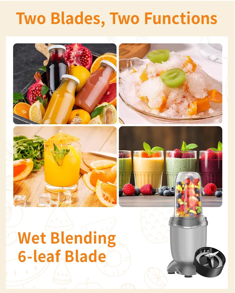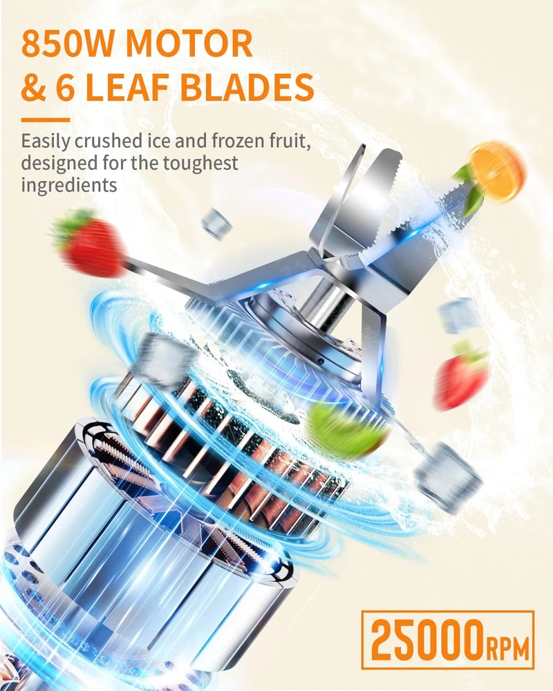 【Powerful Upgraded Smoothie Blender】850-peak-watt motor powers through the toughest ingredients and pulverizes ice to snow in seconds for creamy frozen drinks, smoothies, sauces, and more. Start experience exceptional blending power for smoothies and shakes, frozen drinks, sauces, and more. 【Efficiently Extract Nutrients】Upgraded 6-Leaf Stainless Steel Blade with High-Speed 25000 RPM, allow unlock hidden nutrition from whole fruits and veggies. Extract a drink containing vitamins and nutrients from fruits and vegetables. Achieve smooth and consistent results with the high-speed blending capability, allowing you to prepare your favorite drinks in seconds. 【Multifunctional Compact Blenders】Juice blender machine can mix, blend, grind, which meets your versatile needs. The 6-leaf blade can be used for smoothies, juices, shakes, baby food, ice cream, and protein drinks. The powerful string flat blades use cyclonic action to break down tough ingredients, and are also great for grinding like coffee beans, nuts, spices. 【Easy Operation & Clean】The upgraded blender is thoughtfully designed with a safety lock, which provides you with safety protection while freeing your hands. Powerful 25000 RPM pulse technology portable blenders efficiently extracts vitamins and nutrients from fruits and vegetables, enjoy the perfect healthy drink in just 10-20 S. You can just wash all the accessories (except the motor) with dishwasher or rinse them with running water. Simplify your blending experience, minimize cleanup time. 【Capacity Upgrade Trave Cups】Conveniently prepare and store your smoothies with the large 26oz blender cup. You can blend directly in the 26oz cup, mix well and enjoy directly or take away. Simplify your busy lifestyle, enjoy tasty & healthy homemade beverages everywhere. 【Perfect Gift for Any Occasion】This multifunctional blender is a great gift for your loved ones, parents, friends or colleagues on special occasions like Christmas, New Year, Birthdays, or Mother’s & Father’s Day.