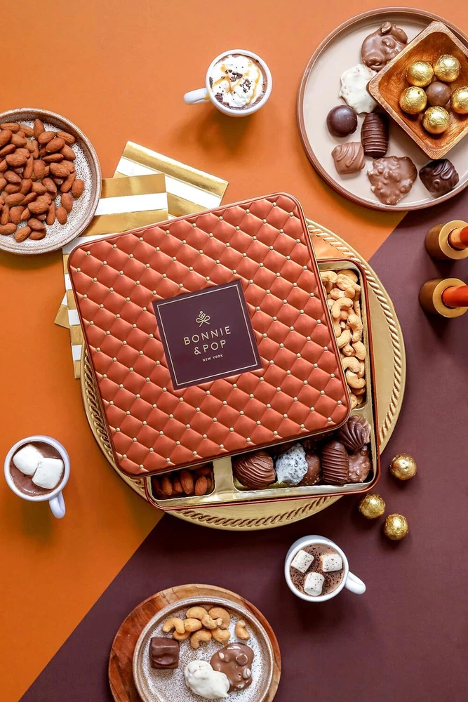 Give them a unique token of your appreciation with this remarkable assortment of luxury snacks. This gift pairs wonderfully with a glass of wine, dried fruit, or a cheese board. The mix of savory nuts and sweet confections truly satisfies all cravings. It serves as the perfect gift box for co-workers, hostess, Mom or Dad, for dessert, to say Happy Birthday, and to say Thank you. It is versatile and will be treasured by all. The tin box is delicately embossed with a tufted design and is luxurious to the touch. Unfortunately, our snacks won’t last long, (they’re too tempting) but we’ve had customers use this tin for cookie swaps and to present fresh baked goods or fine desserts. Use it as a popcorn tin at the family gift exchange or to hold your jewelry. Really, the options and ideas are endless. Are you looking for a budget friendly present that will be sure to impress them? Can't decide between healthy nuts and delicious chocolates? Choose the gift that has both! Our salty nut assortment and decadent chocolates is a winner for any crowd. And the elegant tin will be reminder of your gift long after the food is finished. Indulge in assorted delicious treats including Salted Nut Mix, Praline Peanuts, Double Chocolate Foiled Balls and 15+ individually wrapped Belgian Chocolate Trufffles. Perfect gift for corporate, co-workers, friends, and family alike. The right choice for multiple occasions like Fathers Day, Thanksgiving, Christmas, Hanukah, Valentine’s Day, Birthdays, Sympathy, Condolence, to say Thank You, I Love You, and everything in between. If you are sending this to someone else, don’t forget to add a gift message at checkout! Each section is individually wrapped to promote freshness and cleanliness for sharing. Keepsake tin is a remembrance long after the occasion and snacks are gone - send to yourself. SATISFACTION GUARANTEED: Each gift is 100% money-backed guaranteed to delight. If you don’t love it for any reason, us and we will take it back, no questions asked.