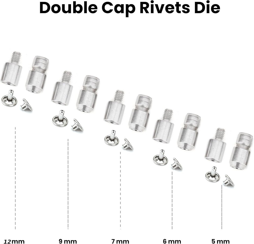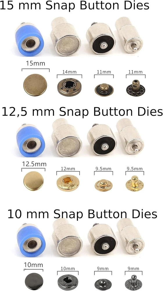 Snap Button Fastener, Rivet, Eyelet, Grommet Hand Press Machine with Setting Dies All in One Set ★ This all-in-one set is perfect for setting rivets, eyelets, grommets, and snap button fasteners. The products are made of high quality, durable, and practical to use. Ideal for both professional and amateur use, can be used for DIY projects such as leather craft, fabric, cardboard, garments, belts, bags, and shoes. ★ 100% product new and high quality. Comes with essential installation dies, suitable for various snap buttons, rivets, grommets and eyelets. Easy to operate, can punch and set quickly and easily. ✔ Includes 17 pieces: Hand press machine, 3 sets Snap Button Dies, 5 sets Double Cap Rivet Dies, 5 sets Eyelet Grommet Dies and 2 mm, 4 mm hole punchers for press machine. ✔ Setting Dies: 10 mm, mm and 15 mm s spring metal snap button dies, 5 mm, 6 mm, 7 mm, 9 mm and 12 mm double cap rivet dies, mm, mm, 6 mm, mm and 9 mm eyelet grommet dies and 2 mm, 4 mm punching dies with one brass base. ⚠ Please note that: The accessories are not included. This listing includes hand press machine and installation dies molds. Rivet, grommets and snap buttons are not included. Hand press machine Specs: Machine is product new DZNTOOLS, made of aluminium and manufactured in Turkey. It weighs 1650 is a universal machine and, with the proper die, you can use it to install snaps, grommets, eyelets, fabric-covered buttons, rivets, jeans tack buttons, top screw thread diameter is 1/4'' inch (6,3 mm). The bottom diameter size is 1/2’ inches (11,9 mm)Dies Specs: Dies screw top thread size of mm (1/4"), bottom diameter size of mm (1/2’’), and are compatible with DZNTOOLS hand press machine. If you have a different hand press, please check your hand press measurements to ensure they match the requirements of your machine.Package includes press machine, 3 sets Snap Button Dies, 5 sets Double Cap Rivet Dies, 5 sets Eyelet Grommet Dies and 2 mm, 4 mm hole punchers and brass base. Total 17 pieces.