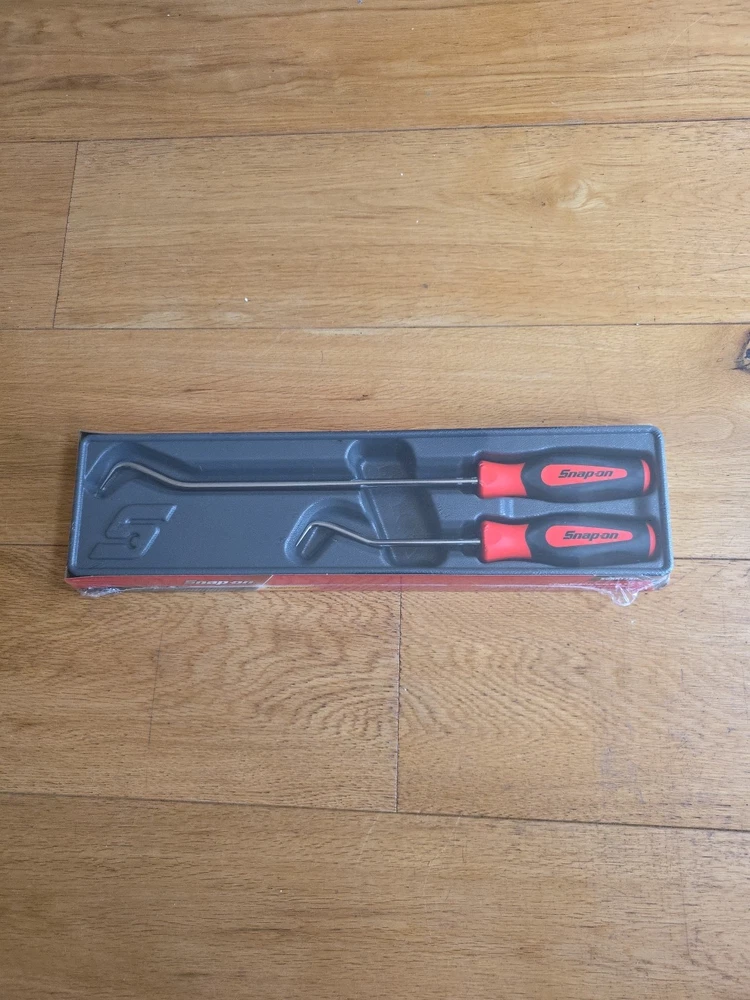 The Snap-on SGRHT2BO Soft Grip Radiator Hose Pick Set consists of 2 pieces in an eye-catching orange color. This durable set is manufactured in the United States and features a soft grip handle for comfortable use. The tools are designed for efficiently removing and installing radiator hoses in vehicles, making them a valuable addition to any mechanic's toolbox.