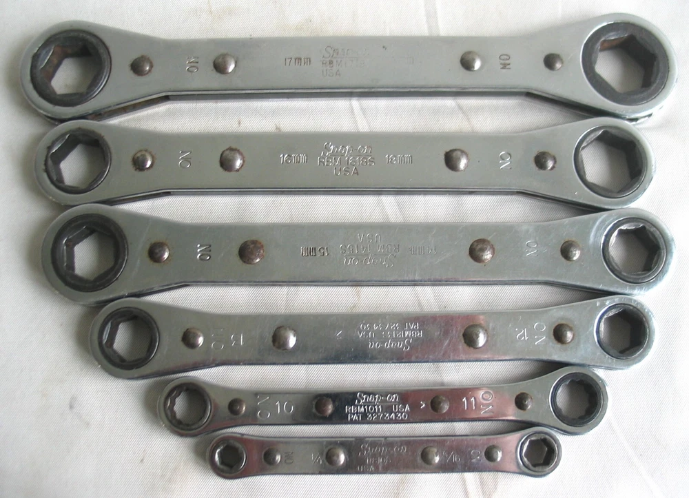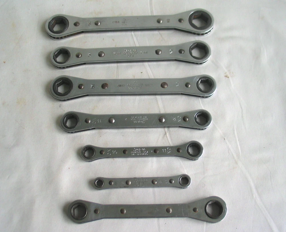From estate of a retired mechanic, this listing is for a SNAP-ON set of Metric/SAE ratcheting box wrenches in a SNAP-ON pouch C-62B plus an extra ARMSTRONG made in USA 1/2 -9/16 wrench 27-593. The Snap-On wrenches are as follows: RBM1719 17MM 19MM RBM1618S 16MM 18MM RBM1415S 14MM 15MM RBM1213S 12MM 13MM RBM1011 10MM 12MM R810S 1/4 5/16 [ SAE All are in good used condition. All my items are sold as found so please email all questions before bidding. I offer ground advantage shipping. Total weigh of set and extra is 3lb3.9oz. Thank you for looking