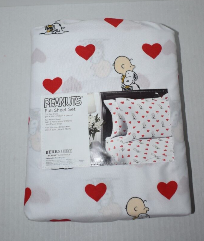 Peanuts Snoopy Hugging Charlie Brown and Red Hearts Pattern Full Size Sheet Set White sheets with a Snoopy Hugging Charlie Brown and red hearts pattern Includes: 1 Flat Sheet - 81" by 96" 1 Fitted Sheet - 54" by 75" 2 Pillow Cases - 20" by 30" Made of 100% Polyester New in package Customer satisfaction is my # 1 Priority!! Please contact me if you are not satisfied with any aspect of your purchase before leaving any feedback. S5
