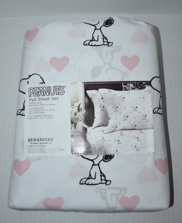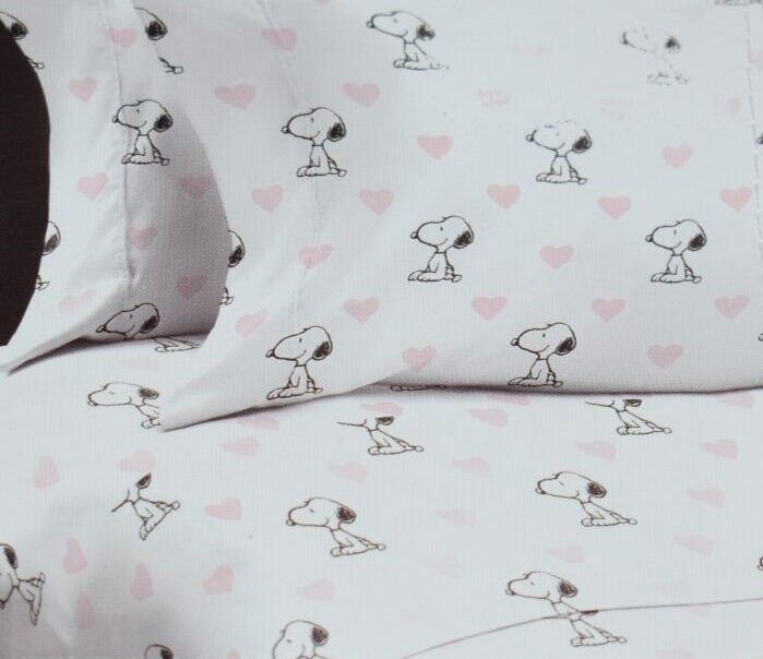 Peanuts Snoopy and Pink Hearts Pattern Full Size Sheet Set White sheets with a Snoopy and pink hearts pattern Includes: 1 Flat Sheet - 81" by 96" 1 Fitted Sheet - 54" by 75" 2 Pillow Cases - 20" by 30" Made of 100% Polyester New in package Customer satisfaction is my # 1 Priority!! Please contact me if you are not satisfied with any aspect of your purchase before leaving any feedback. S5
