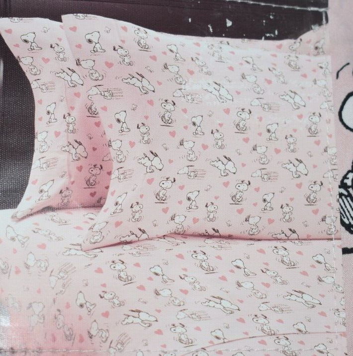 Peanuts Snoopy and Hearts Pink Valentine Pattern Queen Size Sheet Set Pink sheets with a Snoopy, Woodstrock, and hearts pattern Includes: 1 Flat Sheet - 90" by 102" 1 Fitted Sheet - 60" by 80" 2 Pillow Cases - 20" by 30" Made of 100% Polyester New in package Customer satisfaction is my # 1 Priority!! Please contact me if you are not satisfied with any aspect of your purchase before leaving any feedback. S5