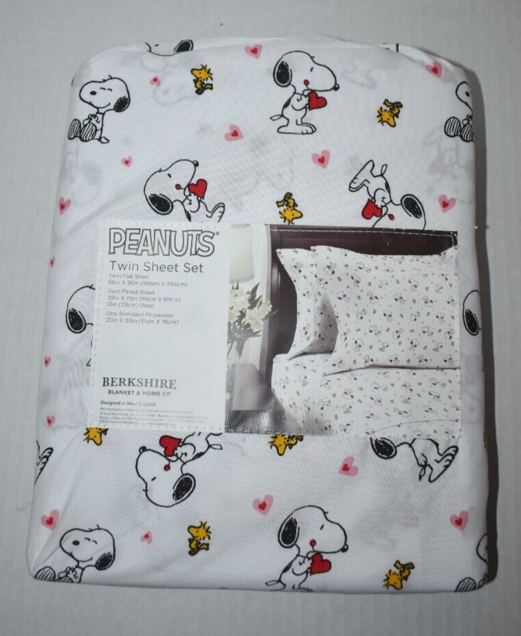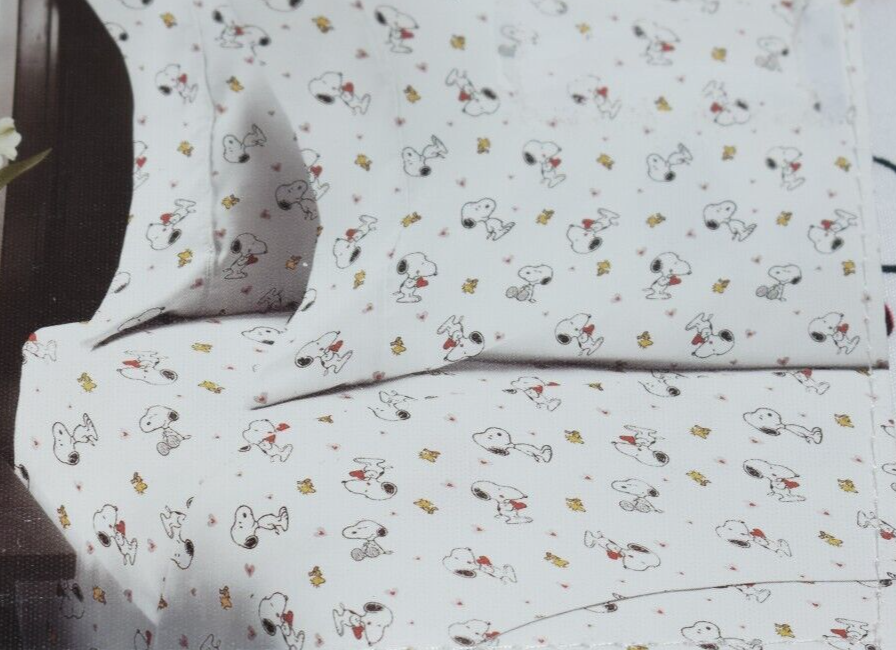 Peanuts Snoopy and Woodstock Valentine Hearts Pattern twin Size Sheet Set White sheets with a Snoopy, Woodstrock, and hearts Includes: 1 Flat Sheet - 66" by 96" 1 Fitted Sheet - 39" by 75" 1 Pillow Case - 20" by 30" Made of 100% Polyester New in package Customer satisfaction is my # 1 Priority!! Please contact me if you are not satisfied with any aspect of your purchase before leaving any feedback. S5
