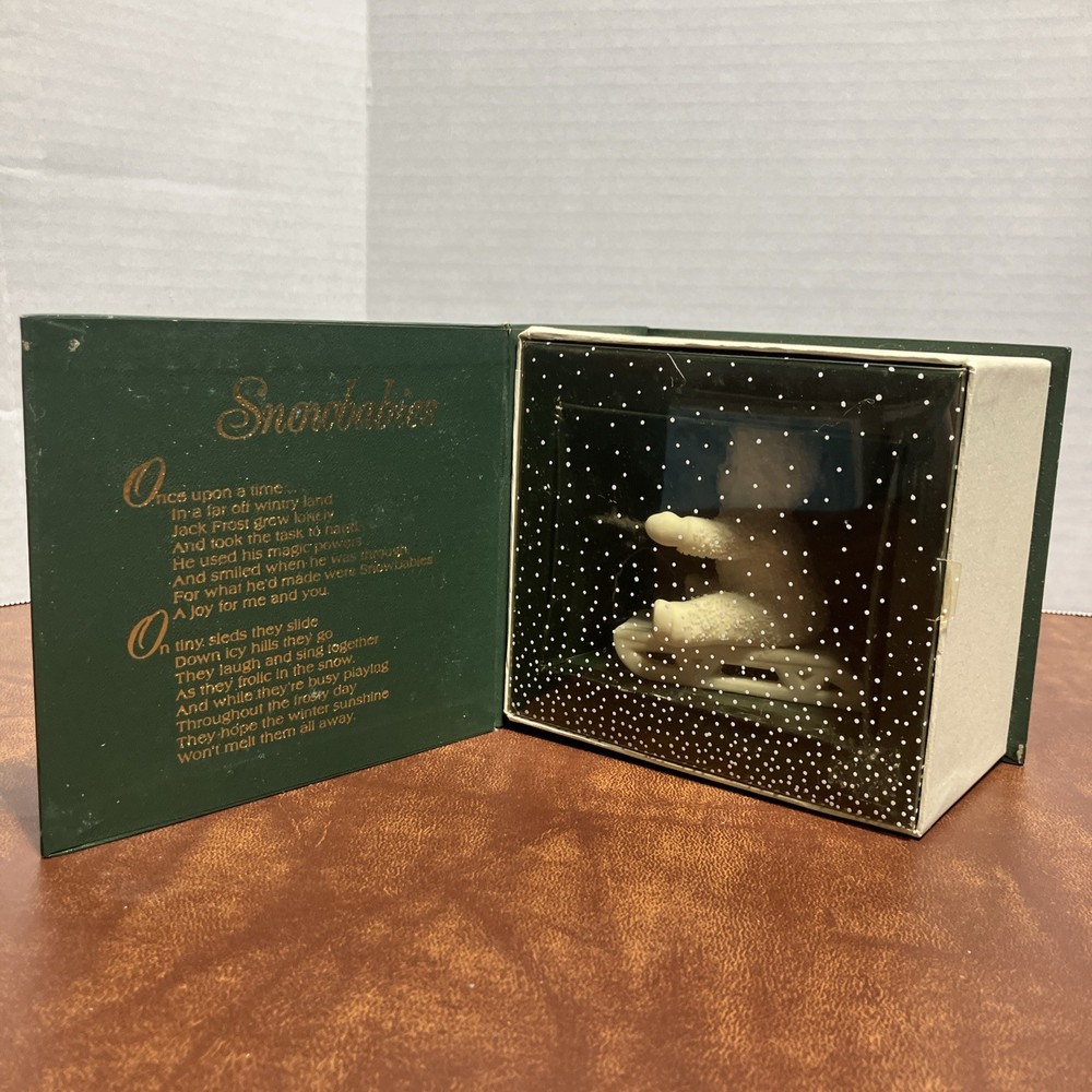 The product is a vintage Department 56 Snowbabies figurine from 1988, featuring a Snowbaby on a sled. This collectible item comes in its original box, making it a valuable addition to any holiday or seasonal figurine collection. Perfect for fans of Department 56 and collectors of adorable Snowbaby figurines, this piece captures the charm and nostalgia of winter scenes from 1988. Please feel free to contact me with any questions you have