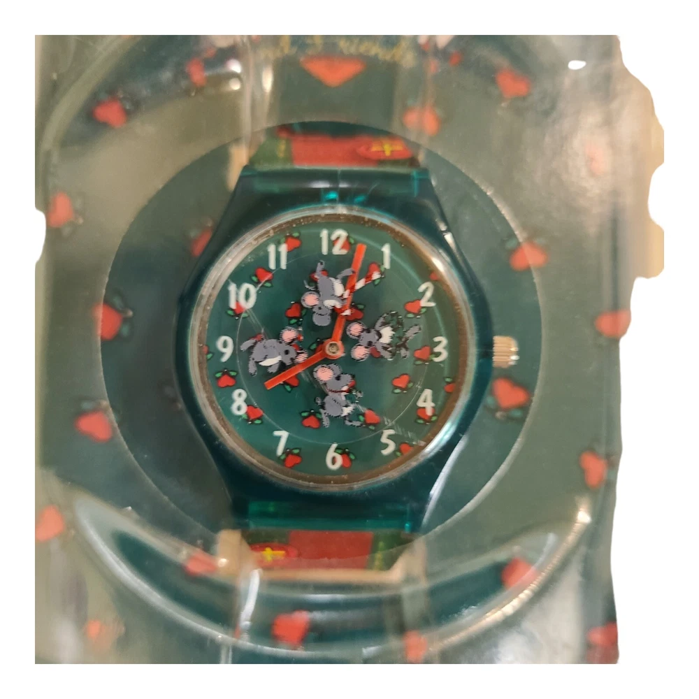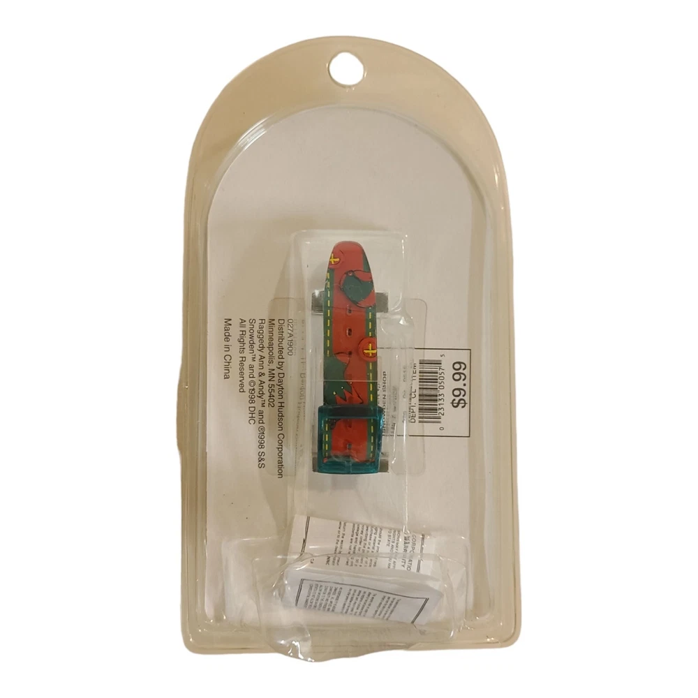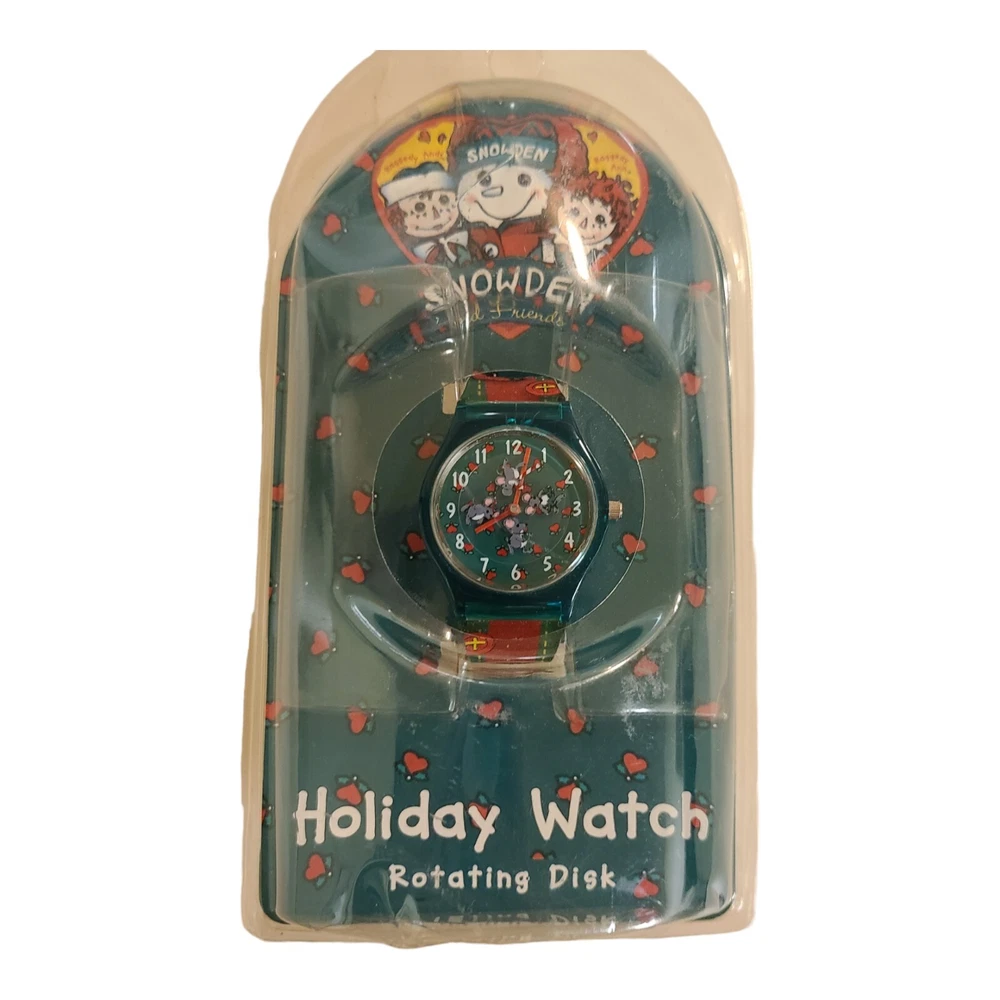 This is a beautiful and unique Snowden Raggedy Ann and Andy Holiday watch. It features a rotating disc and was produced in 1998. The watch is brand new and has never been worn, making it a great addition to any collection. The color scheme of red and blue is perfect for the holiday season, and the watch is sure to be a conversation starter. Whether you are a fan of Snowden watches, Raggedy Ann and Andy, or just looking for a one-of-a-kind timepiece, this watch is a must-have. Pre-owned and purchased from a nice estate, in original packaging. Please look at all pictures carefully, as they are part of the description and use the zoom feature to determine condition. Feel free to email me with any questions. Thanks for looking!!
