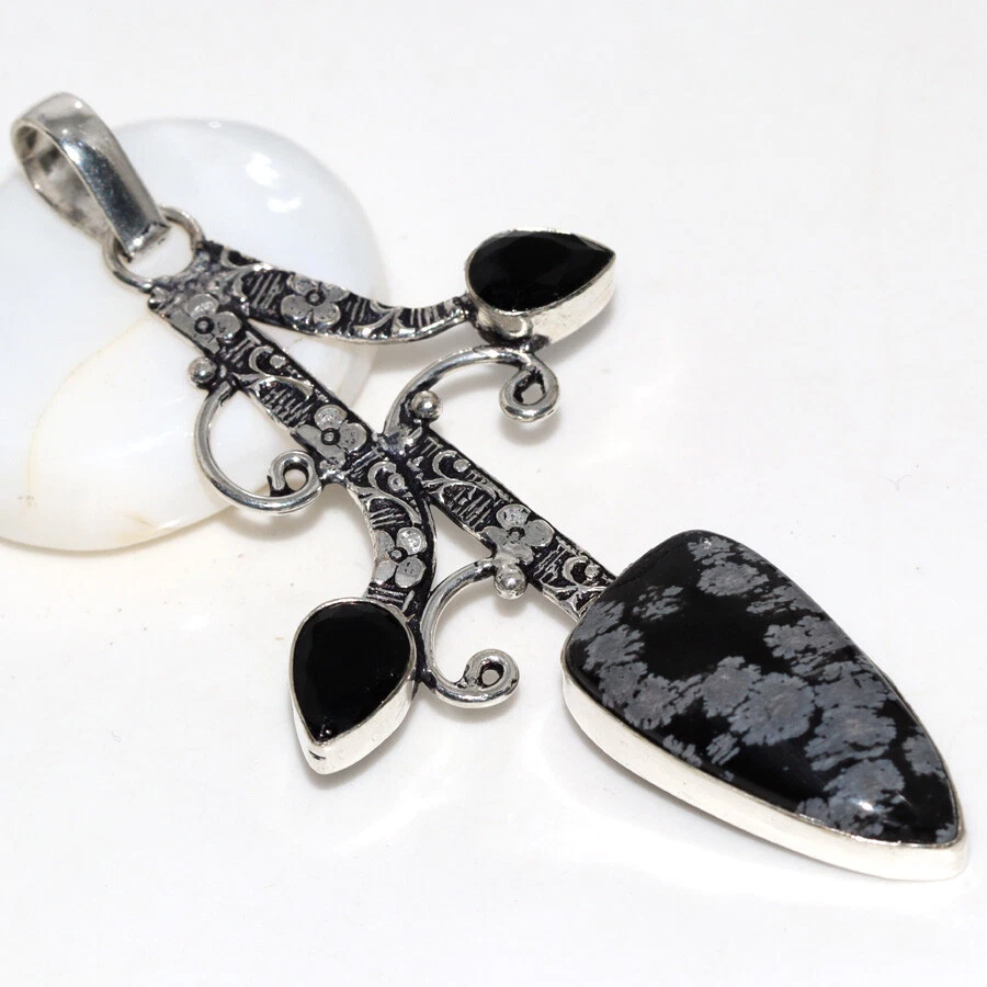 Snowflake Obsidian Black Onyx 925 Silver Plated New Arrival Pendant 3.1" JW