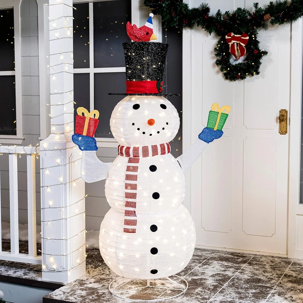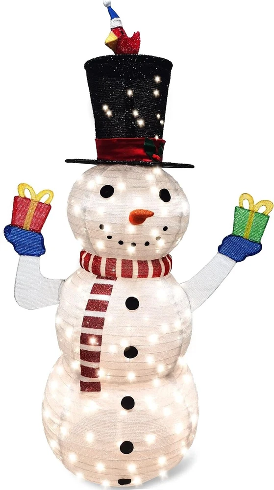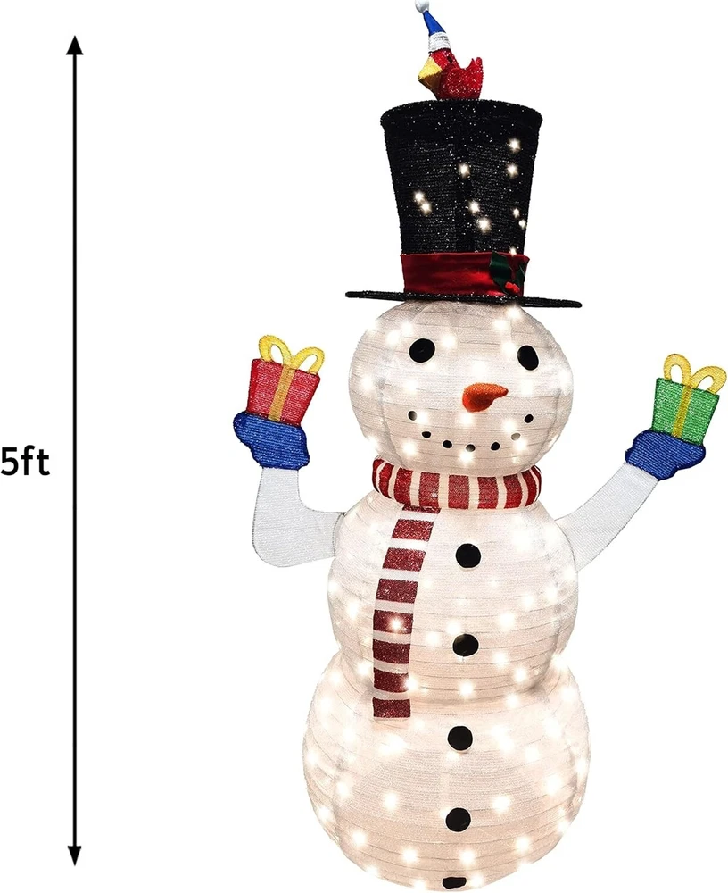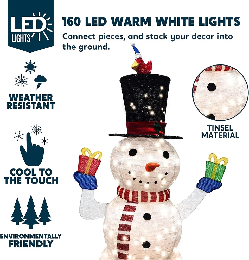 Color White Brand Joiedomi Material Metal Theme Christmas Light Color Warm White About this item SUPER VALUE PACK. Our Snowman Yard Light includes a 5 Feet Tall Collapsible Snowman with 160 LED Warm White Lights in Clear Wire and Metal Stakes. Made of Tinsel Material. UNIQUE DESIGN & EASY TO USE. Our own unique Snowman holding gift boxes design of Christmas Yard Light is easy to set up. These are pre-wired frames and very durable. Perfect for indoor/outdoor use. PERFECT DECOR. If you’re someone who favors traditional over trendy, this LED Yard lights is for you, these are classic and unique. Use our yard decor to create wonderful, lifelong memories for the youngsters in your life. Ideal for winter decoration, Christmas night event, and Winter Paradise Themed Party. PREMIUM QUALITY. These are safe to use. Ground stakes for securing ground placement. Please read the safety instructions manual before use. CUSTOMER SATISFACTION. Providing a great shopping experience is our main priority to our customers. Feel free to message us through “contact seller'' if products don't meet your expectations. Buy form Anson's Discount Depot with confident: If the one you received fail to work, “Contact Seller” and we will refund you or ship you a replacement. We stand behind our Products!