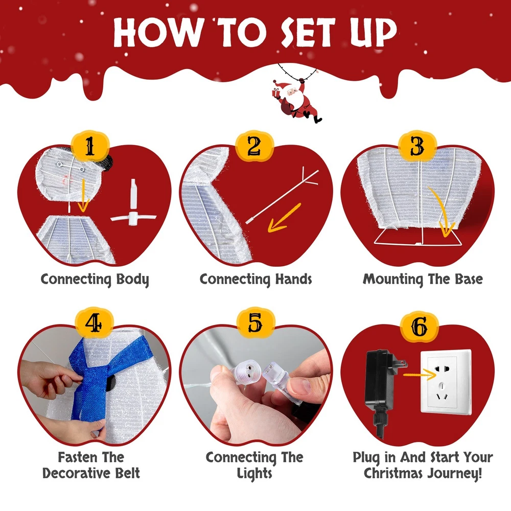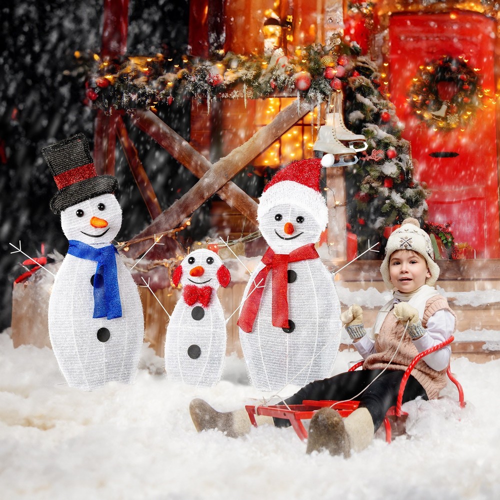 Create a warm and festive atmosphere with this enchanting set of Christmas lighted decorations. Perfect for both indoor and outdoor use, these glowing holiday displays will instantly brighten up your home, yard, or patio, making them a great addition to your seasonal décor. With durable construction and weather-resistant materials, these decorations are designed to withstand winter conditions, ensuring that they will bring holiday cheer year after year. Easy to set up and store, they provide a hassle-free way to enhance your holiday celebrations. Features: 1. Adorable Christmas Decoration: This set features a charming father, mother, and baby snowman, each wrapped in sparkling tinsel, with joyful expressions and open arms to welcome the Christmas season. Their delightful appearance will instantly enhance the festive spirit of your home and yard. 2. Eye-catching LED Lights: Pre-lit with 80 well-placed LED lights, the snowman family radiates a soft, white glow that illuminates your space beautifully at night. The lights bring your outdoor decor to life, making your home the highlight of the neighborhood during the holidays. 3. Easy Assembly and Storage: This collapsible Xmas decoration can be set up in minutes, allowing you to enjoy your festive display without hassle. Once the holiday season is over, the snowmen easily fold down into a compact size for convenient storage. 4. Weather-Resistant and Sturdy Build: Made from a durable, rustproof metal frame with waterproof fabric, this set is built to withstand wind, rain, and snow. The included ground stakes provide extra stability, ensuring your decorations stay secure in winter weather. 5. Perfect Holiday Decor for Indoor & Outdoor: Whether displayed in your living room, near your Christmas tree, on the porch, or in the yard, this lighted Christmas decoration adds a magical and cozy ambiance to any space. Its lightweight design makes it easy to move and position them wherever you want to spread holiday cheer. Specifications: 1. Father Snowman Size: (19.5 x 29) in / (49.5 x 73.7) cm 2. Mother Snowman Size: (19.5 x 28.5) in / (49.5 x 72.4) cm 3. Baby Snowman Size: (17 x 17) in / (43.2 x 43.2) cm 4. Overall Dimensions: (29 x 56) in / (73.7 x 142.2) cm 5. Number of Lights: 80 pcs 6. Light Color: White Package Includes: 1 x Snowman Family Christmas Lighted Decoration 1 x Set of Ground Stakes