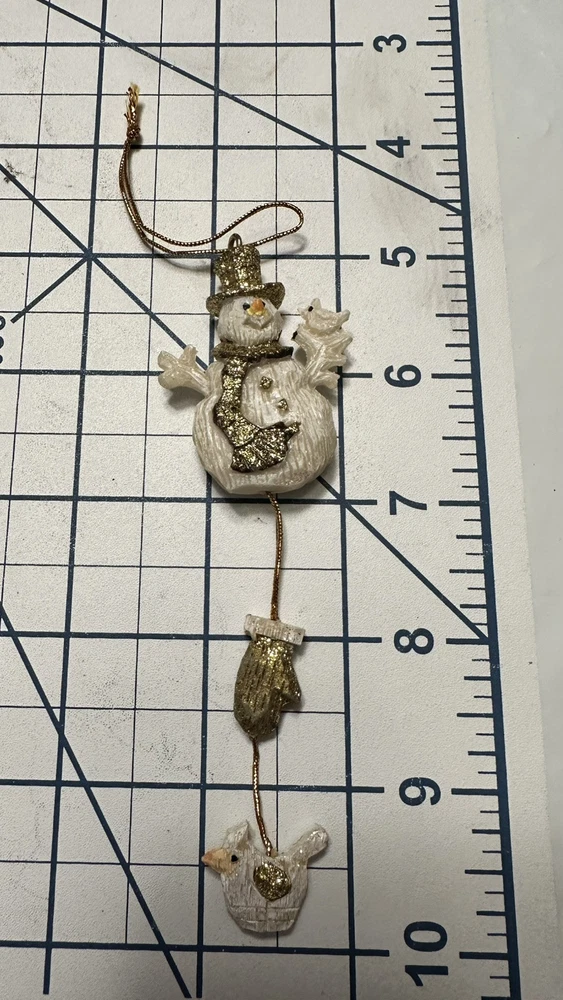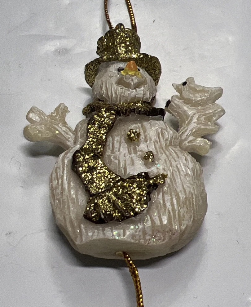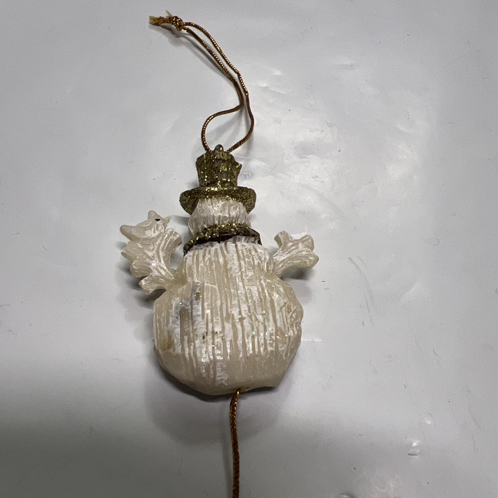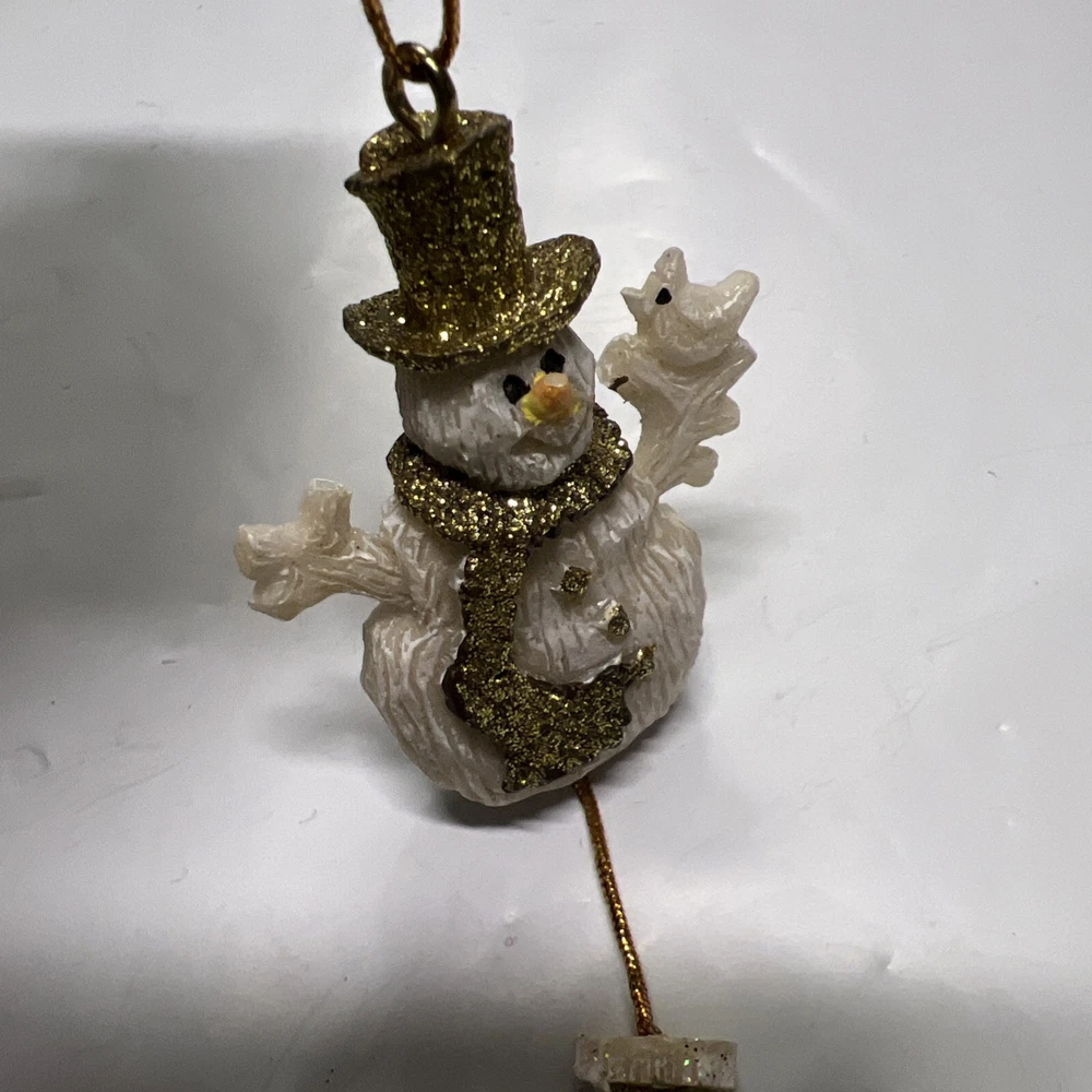 This ornament is a charming Snowman Holding Bird design in white and gold, embellished with glitter for a festive touch. The snowman is depicted holding a bird, adding a whimsical element to the Christmas-themed decoration. It features a hanging design, making it easy to display on a Christmas tree or around the home during the holiday season. Perfect for adding a touch of holiday cheer and sparkle to any space.