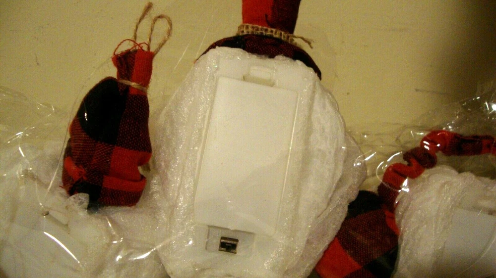 Here is a set of 3 hanging led snowman heads, can be used for ornaments on larger size trees or could hang on shelf hook, etc, they are mixed designs and have attached plastic battery box on backs as i show in picture and takes 2 AA batteries that are Not included, each have 6 hour timer also, they are made of polyfoam and ans wrapped in snow white fabric and have face designs, they each measure 6.5 inch high by 4.5 inch wide, are a larger size ornament and would accent any larger tree nicely hanging or can use for hanger on hook, etc and check out my many other nice holiday and everyday decor and lighting.